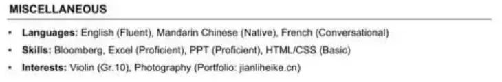 最后一部分Miscellaneous,也就是其他的意思,在这里,我们可以写自己的技能与证书,比如视频剪辑、p图等等;还有语言水平:CET-6之类的;还有能为自己加分的爱好。