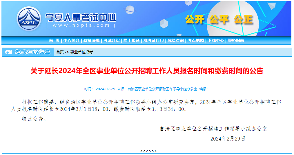 根据工作需要,经自治区事业单位公开招聘工作领导小组办公室研究决定,2024年全区事业单位公开招聘工作人员报名时间延长至2024年3月1日18:00,缴费时间顺延至3月3日24:00。