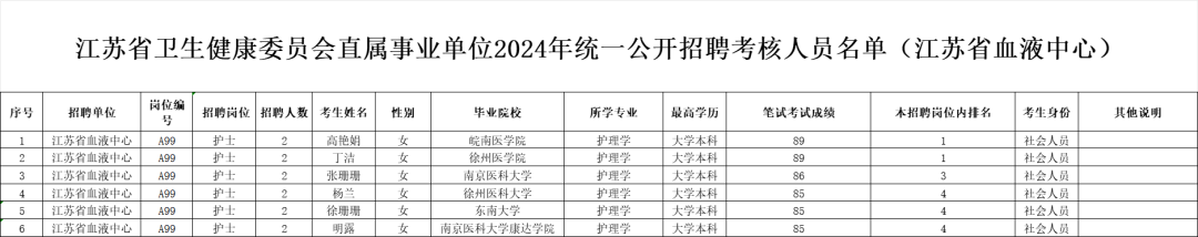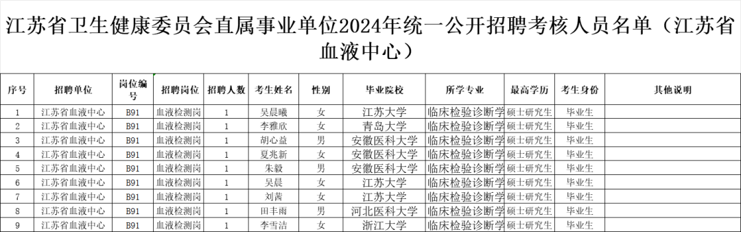 1. 江苏省血液中心2024年公开招聘工作人员应聘人员名单