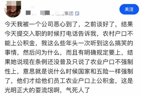 当一个公司因为你是农村户口,就不给你上公积金,这不仅仅是影响你现在的收入,更是在影响你未来的生活规划。