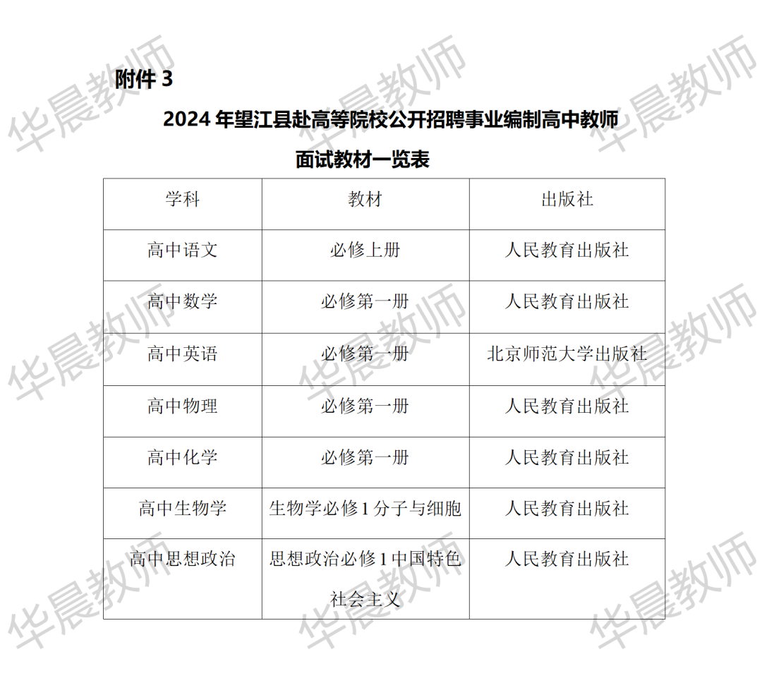 附件3:2024年望江县赴高等院校公开招聘事业编制高中教师面试教材一览表。