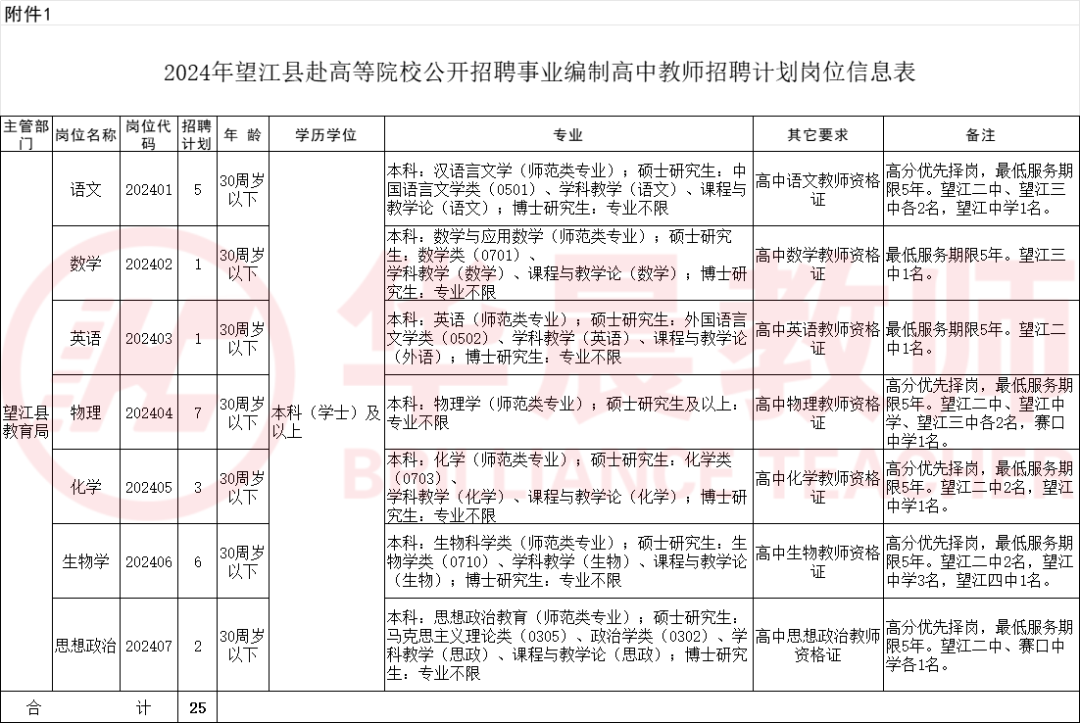 附件1:2024年望江县赴高等院校公开招聘事业编制高中教师招聘计划岗位信息表;