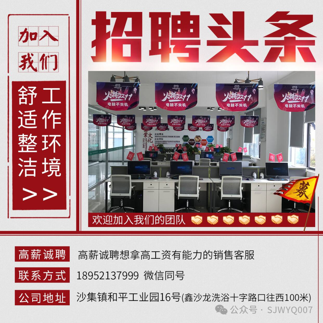 招聘:淘宝多多客服,要求有工作经验优先,对工作认真负责, 工资5000-5500。 不是熟手也可以教,工资面议 。(工作地址沙集街上)可年后上班13228706677