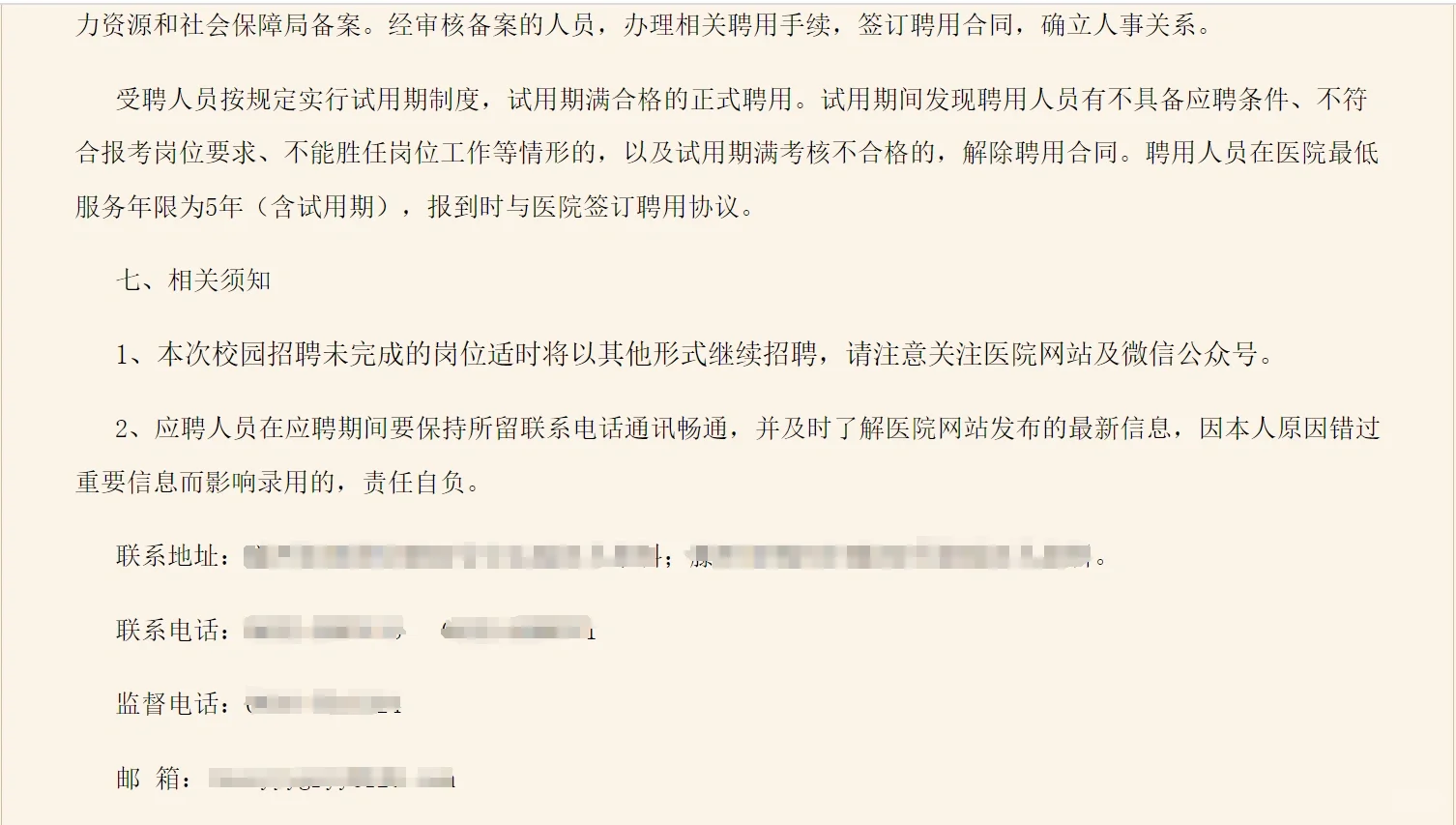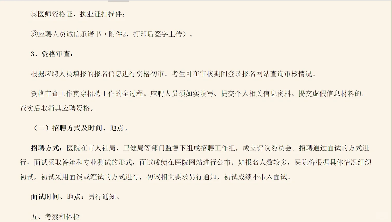 招聘方式:医院在市人社局、卫健局等部门监督下组成招聘工作组,成立评议委员会。招聘通过面试的方式进行,面试采取答辩和专业测试的形式,面试成绩在医院网站进行公布。如报名人数较多,医院将根据具体情况组织初试,初试采用面谈或笔试的方式进行,初试相关要求另行通知,初试成绩不带入面试。