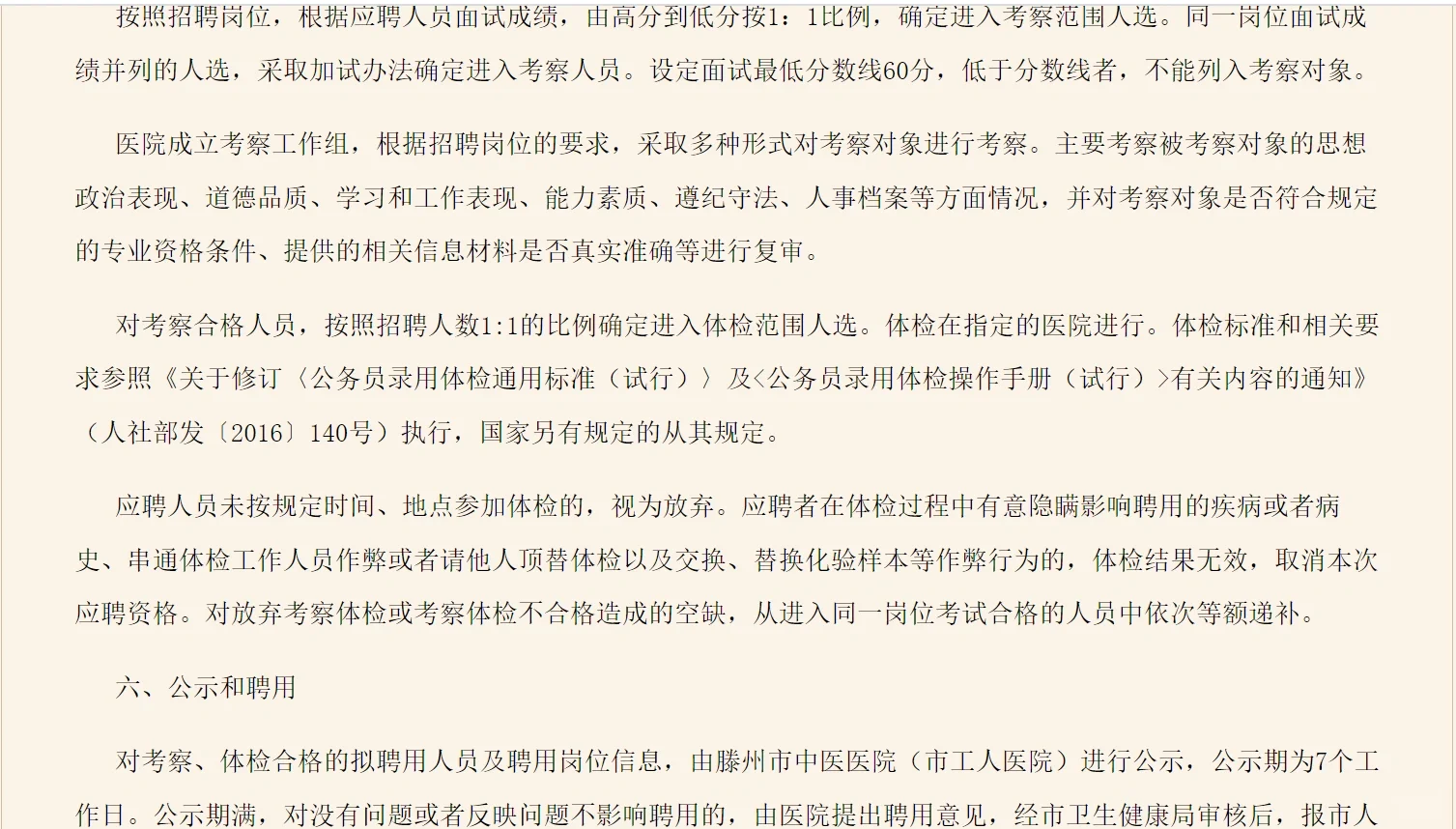 对考察合格人员,按照招聘人数1:1的比例确定进入体检范围人选。体检在指定的医院进行。体检标准和相关要求参照《关于修订〈公务员录用体检通用标准(试行)〉及<公务员录用体检操作手册(试行)>有关内容的通知》(人社部发〔2016〕140号)执行,国家另有规定的从其规定。