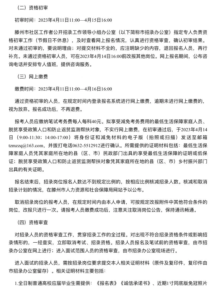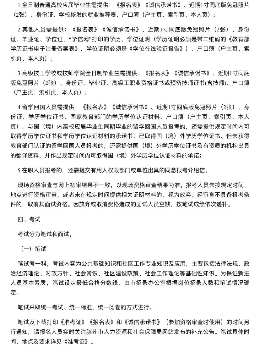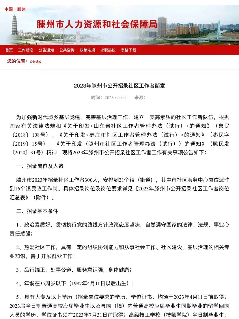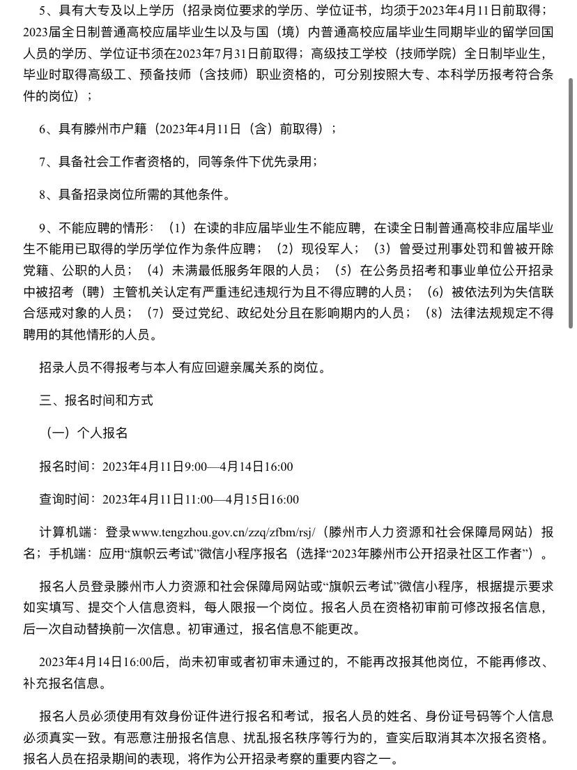 1️⃣首先需要随时关注滕州人社部门发布的社区工作者招考信息,预计会在3.4月份出公告,招考信息出来之后,根据招考的条件和岗位进行报考,可参考去年的条件。
