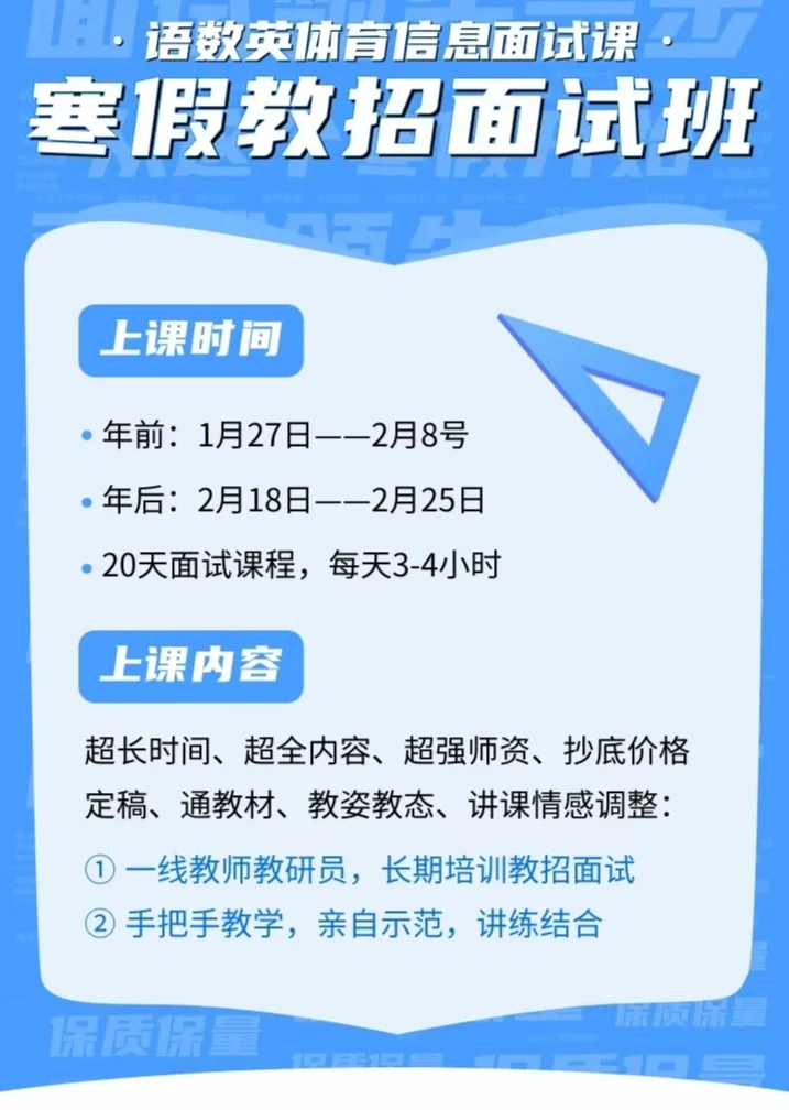 备考2024年教育类人才引进/校园招聘/公开招聘面试前置考生注意:为应对春节后招考高峰,提前备战面试才能稳操胜券,教师编面试寒假集训课程将于1月27日开课,一线教师教研员培训,各学科小班制开课教学,满足提前学、提前练,避免被逆袭,研究不透教材就上考场面试。