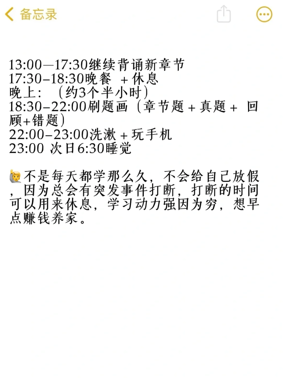 🙋不是每天都学那么久,不会给自己放假,因为总会有突发事件打断,打断的时间可以用来休息,学习动力强因为穷,想早点赚钱养家。