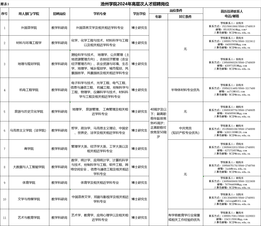 见附件1《池州学院2024年高层次人才招聘岗位》
