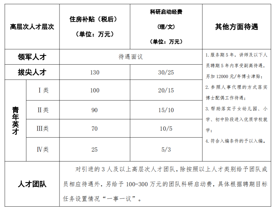 1.高层次人才享受住房补贴,在档案到校后一次性发放70%,中期考核合格后发放20%,服务期满考核合格发放10%。