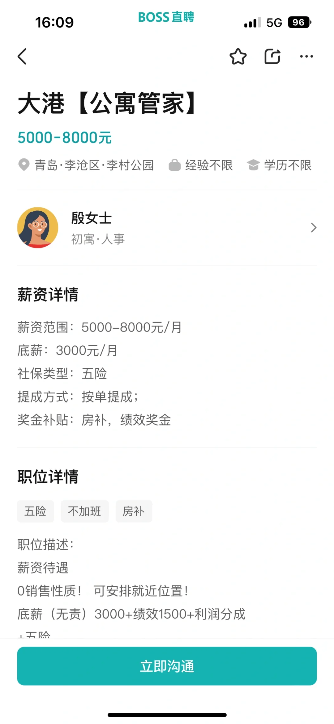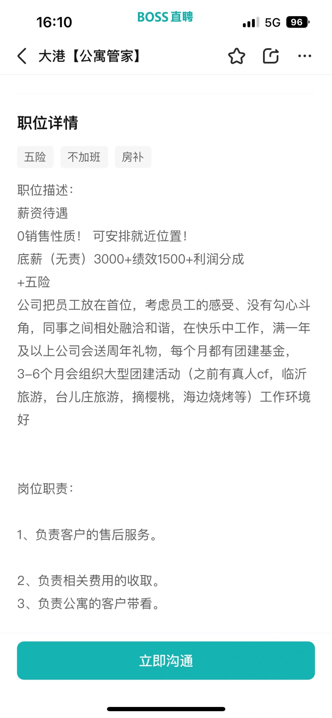 Boss招聘信息如图所示,工作地点在燕儿岛这边的公寓,在附近的朋友有想找工作的可以考虑一下,主要工作就是管着五十多间房子,催房租,到期了往外出租,工作不累,工作时间八点半到五点半,不加班,平时法定节假日都放假,每月调休。综合薪资6000➕,有能力者更多。 主要是我要离职了,然后公司得等到招到新人之后我才能走