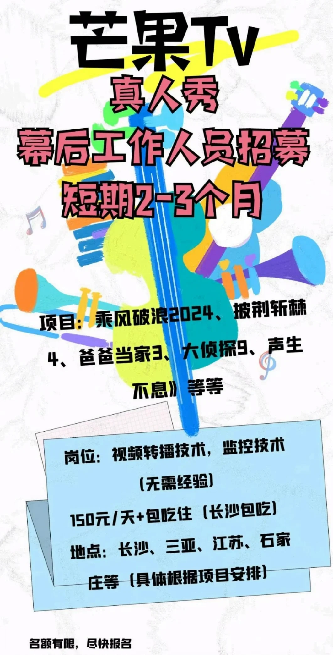 芒果tv综艺节目招人啦 芒果TV综艺节目工作人员招聘(2-3个月) 岗位内容: 视频转播技术,监控技术,可接受新人 合作项目: 《乘风破浪2024》、《披荆斩棘4》、《大侦探9》、《声生不息》、《百分百出品》、《我家那闺女》、《魔方新世界》、《小熊花园》、《爸爸当家3》等 💰💰💰👇 薪资: 150元/天,项目结束后优秀人员评估后按照200/天计算 🖌️🖌️🖌️🖌️🖌️ 最新岗位要求已出。 大家可以翻最新的帖子 还有就是啊 全部都是女生来投简历哦,我们女同学可太积极了哦,所以问一下我们男同学有木有啊[捂脸R],因为我们是需要到处出差的,需要吃苦耐劳的同学哦,最后几个名额有限啦,决定一定要来的 先把简历发给我,你会什么?学过什么?有没有从事相关的行业经验?都提前告知我 #招聘 #芒果TV #湖南电视台 #长沙 #转正 #综艺节目 #新媒体 #新媒体运营 #官方大大求流量 #找工作 |