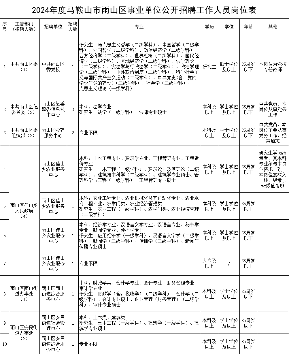 2024年度马鞍山市雨山区事业单位公开招聘工作人员12名,招聘计划(岗位)及报考条件见《2024年度马鞍山市雨山区事业单位公开招聘工作人员岗位表》。