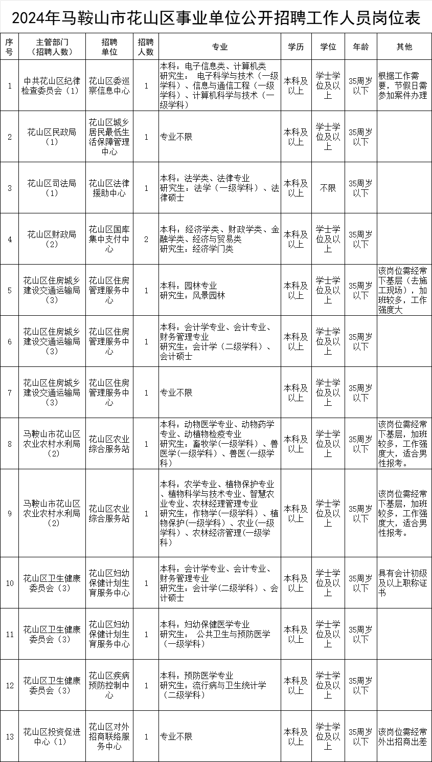 2024年度马鞍山市花山区事业单位公开招聘工作人员14名,招聘计划(岗位)及报考条件见《2024年度马鞍山市花山区事业单位公开招聘工作人员岗位表》。