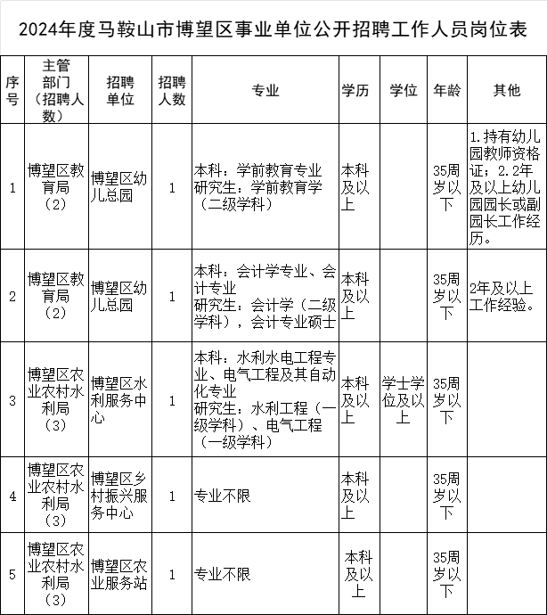 2024年度马鞍山市博望区事业单位公开招聘工作人员5名,招聘计划(岗位)及报考条件见《2024年度马鞍山市博望区事业单位公开招聘工作人员岗位表》。