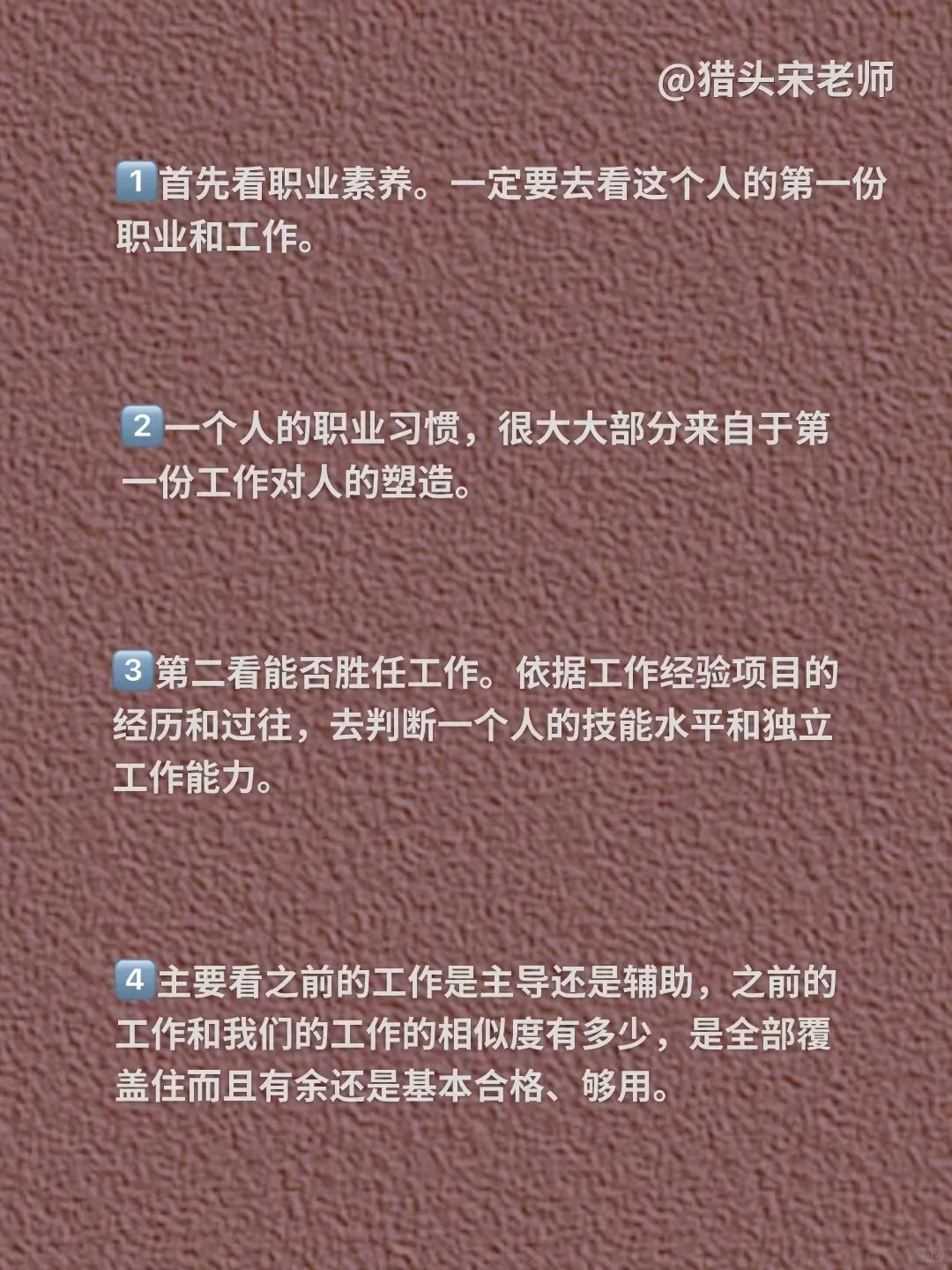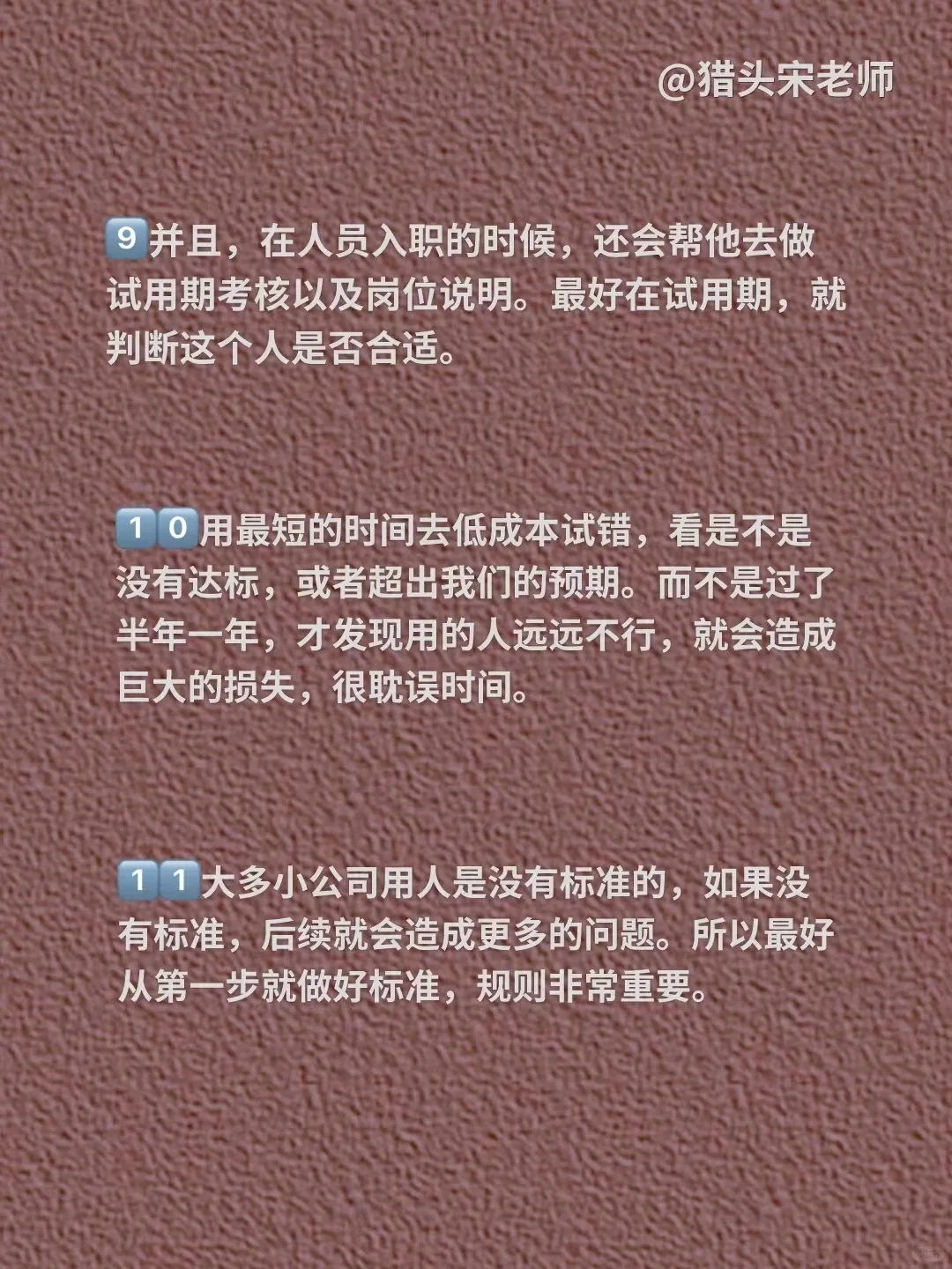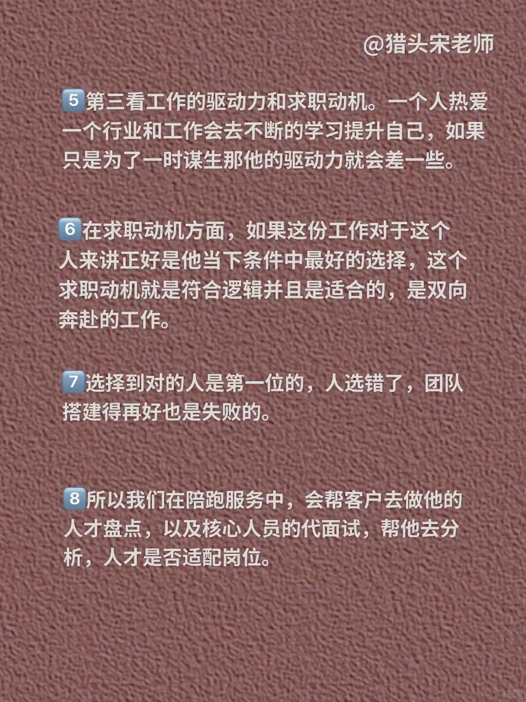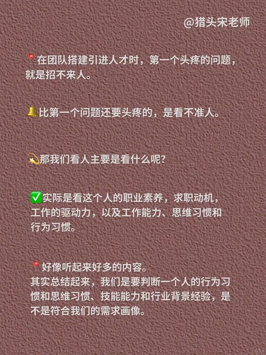 团队搭建,如何选人? 团队搭建,如何选人? 在团队搭建引进人才时,第一个头疼的问题,就是招不来人。 比第一个问题还要头疼的,是看不准人。 那我们看人主要是看什么呢? 实际是看这个人的职业素养,求职动机,工作的驱动力,以及工作能力、思维习惯和行为习惯。 好像听起来好多的内容。 其实总结起来,我们是要判断一个人的行为习惯和思维习惯、技能能力和行业背景经验,是不是符合我们的需求画像。 1、首先看职业素养。一定要去看这个人的第一份职业和工作。 2、一个人的职业习惯,很大大部分来自于第一份工作对人的塑造。 3、第二看能否胜任工作。依据工作经验项目的经历和过往,去判断一个人的技能水平和独立工作能力。 4、主要看之前的工作是主导还是辅助,之前的工作和我们的工作的相似度有多少,是全部覆盖住而且有余还是基本合格、够用。 5、第三看工作的驱动力和求职动机。一个人热爱一个行业和工作会去不断的学习提升自己,如果只是为了一时谋生那他的驱动力就会差一些。 6、在求职动机方面,如果这份工作对于这个人来讲正好是他当下条件中最好的选择,这个求职动机就是符合逻辑并且是适合的,是双向奔赴的工作。 7、选择到对的人是第一位的,人选错了,团队搭建得再好也是失败的。 8、所以我们在陪跑服务中,会帮客户去做他的人才盘点,以及核心人员的代面试,帮他去分析,人才是否适配岗位。 9、并且,在人员入职的时候,还会帮他去做试用期考核以及岗位说明。最好在试用期,就判断这个人是否合适。 10、用最短的时间去低成本试错,看是不是没有达标,或者超出我们的预期。而不是过了半年一年,才发现用的人远远不行,就会造成巨大的损失,很耽误时间。 11、大多小公司用人是没有标准的,如果没有标准,后续就会造成更多的问题。所以最好从第一步就做好标准,规则非常重要。 ———————— #宋老师用人管理群每日分享#图文#图文来了 20231115 |