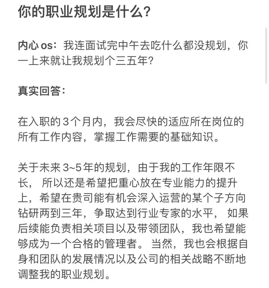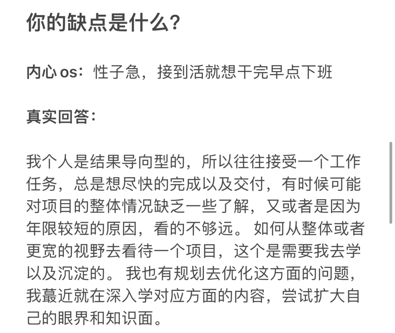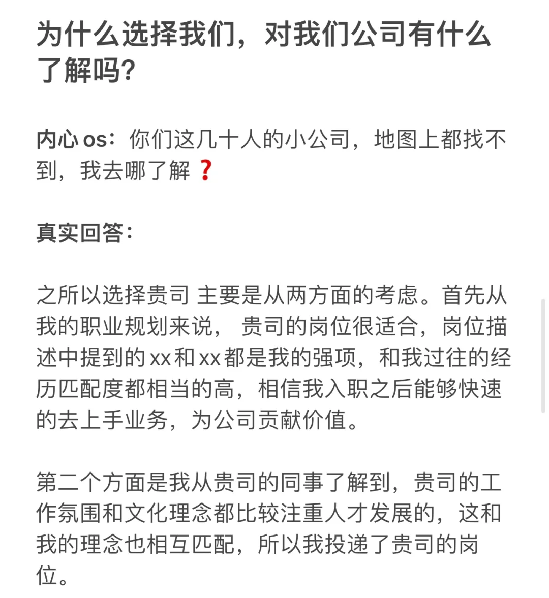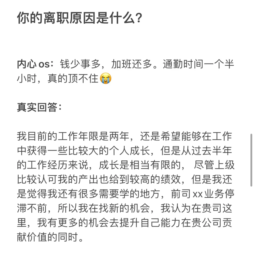 找工作全靠吹牛😅,真的挺爽 又到了一年金九银十。很多宝子发现面试机会相比以前多了,但是面的问题就是答不上来,面的问题都没有见过。 以我去年面了20家公司的经验来说,回答问题的时候,真的要学会扬长避短,多说自己的优点,面试真的会轻松不少。 而且面试真的要多面,面多几家公司就会发现,其实来来去去都是类似的问题。 下面就是一些我去年总结下来的一些常见面试题的回答,在找工作的宝子真的可以🐴住~ 1⃣️ 你的职业规划是什么? 内心os:我连面试完中午去吃什么都没规划,你一上来就让我规划个三五年? 2⃣️ 请做一下自我介绍 内心os:一进门就填了4页表,还拿着我的简历。还要我介绍啥😒 3⃣️ 你的缺点是什么? 内心os:性子急,接到活就想干完早点下班 4⃣️ 你的离职原因是什么? 内心os:钱少事多,加班还多。通勤时间一个半小时,真的顶不住😭 5⃣️ 你的空窗期为什么这么长? 内心os:旅游和休息了半年😄 空窗期真的建议多学些技能,现在越来越多的企业在做出海,学好英语优势真的不小,我之前就因为英语不好被挂过几次简历。最近晚上在提升英语听力能力,发现芝士派🧀英语的无字幕电影形式效果还不错,学起来也不会枯燥~ 6⃣️ 工作中和上级出现分歧会怎么处理? 内心os:都听上级的,不会发生分歧的😄 7⃣️ 你对加班怎么看? 内心os:月薪5k谁给你加班?给多少钱干多少事。 8⃣️ 如果你的工作出现失误,造成经济损失,你会怎么处理 内心os:还能咋办?正常处理呗 9⃣️你的期望薪资是多少? 内心os:还是零offer,给💰就去 #面试有秘招 #求职 #面试技巧 #求职经验侃侃谈 #面试 #找工作 #找工作啊找工作 #求职 #面试题 |