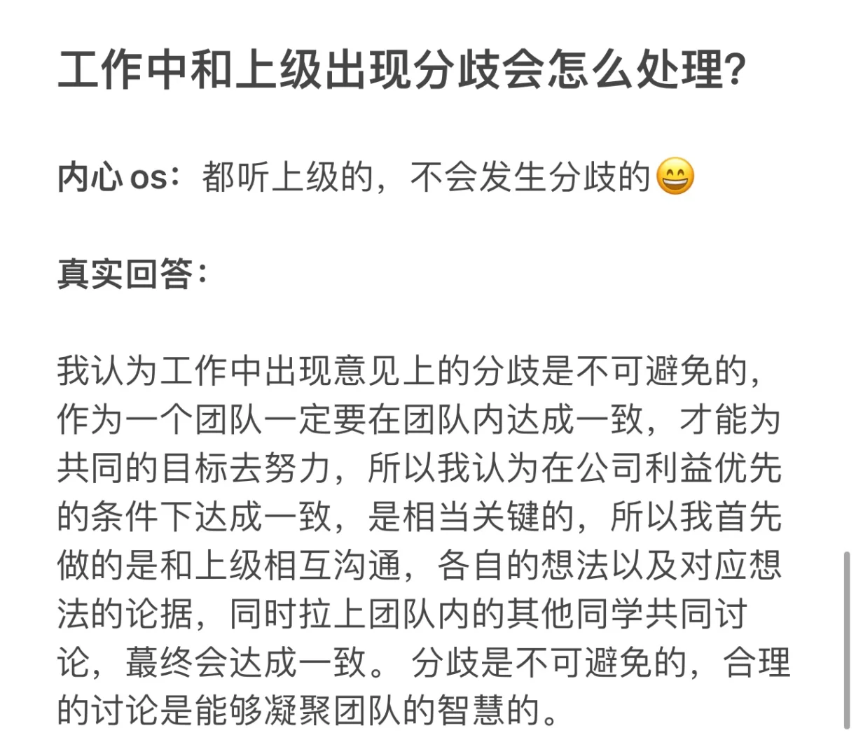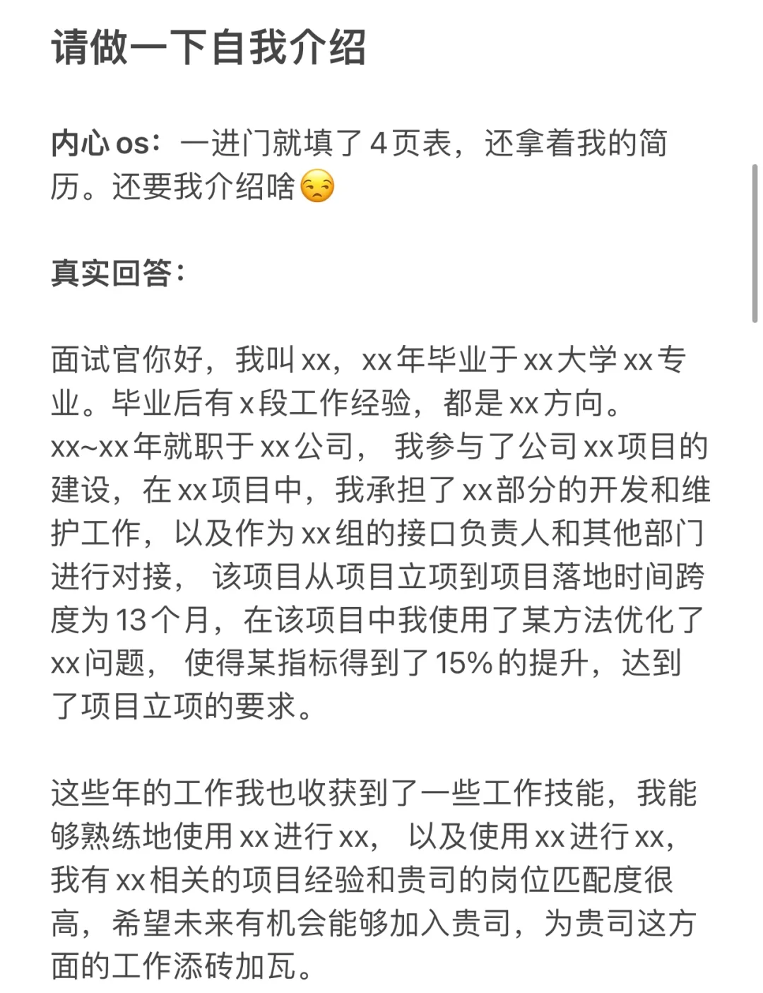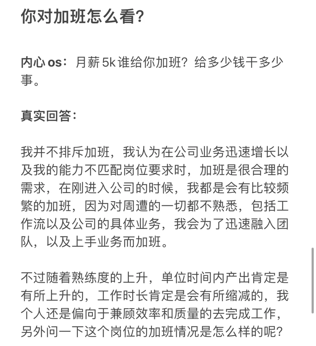 找工作全靠吹牛😅,真的挺爽 又到了一年金九银十。很多宝子发现面试机会相比以前多了,但是面的问题就是答不上来,面的问题都没有见过。 以我去年面了20家公司的经验来说,回答问题的时候,真的要学会扬长避短,多说自己的优点,面试真的会轻松不少。 而且面试真的要多面,面多几家公司就会发现,其实来来去去都是类似的问题。 下面就是一些我去年总结下来的一些常见面试题的回答,在找工作的宝子真的可以🐴住~ 1⃣️ 你的职业规划是什么? 内心os:我连面试完中午去吃什么都没规划,你一上来就让我规划个三五年? 2⃣️ 请做一下自我介绍 内心os:一进门就填了4页表,还拿着我的简历。还要我介绍啥😒 3⃣️ 你的缺点是什么? 内心os:性子急,接到活就想干完早点下班 4⃣️ 你的离职原因是什么? 内心os:钱少事多,加班还多。通勤时间一个半小时,真的顶不住😭 5⃣️ 你的空窗期为什么这么长? 内心os:旅游和休息了半年😄 空窗期真的建议多学些技能,现在越来越多的企业在做出海,学好英语优势真的不小,我之前就因为英语不好被挂过几次简历。最近晚上在提升英语听力能力,发现芝士派🧀英语的无字幕电影形式效果还不错,学起来也不会枯燥~ 6⃣️ 工作中和上级出现分歧会怎么处理? 内心os:都听上级的,不会发生分歧的😄 7⃣️ 你对加班怎么看? 内心os:月薪5k谁给你加班?给多少钱干多少事。 8⃣️ 如果你的工作出现失误,造成经济损失,你会怎么处理 内心os:还能咋办?正常处理呗 9⃣️你的期望薪资是多少? 内心os:还是零offer,给💰就去 #面试有秘招 #求职 #面试技巧 #求职经验侃侃谈 #面试 #找工作 #找工作啊找工作 #求职 #面试题 |