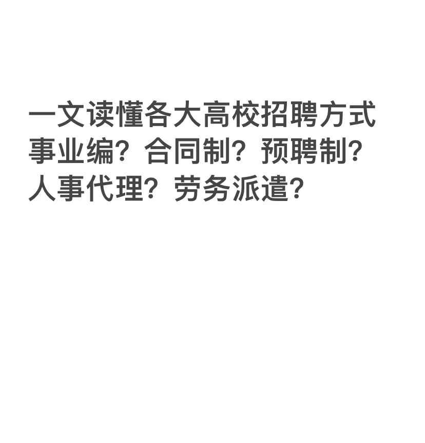 一文讲清楚各大高校招聘方式哪些值得去 高校招聘目前分为五种形式: 1.事业编:报考人数非常多,基本上公办报录比为1比200,985.211报录比大概1比500,入职后非常稳定,高校的公积金缴纳很高。 2.合同制:相对来说也比较稳定,不占用单位编制名额。 3.预聘制(备案制):暂时无编,将来合同到期需要考核,考核次数较多,考核通过可入编,不通过就与学校解除劳动合同,学校方面比较强势,目前许多211才用的方法。 4.人事代理:与学校签合同,要和学校沟通是否同工同酬同晋升,很多学校同工同酬但是晋升路径不同,如果医院去学校工作可以考虑,这个档案是不在学校的! 5.劳务派遣:与第三方公司签订合同派遣到学校工作,这种类型一定要警惕,大概率不会同工同酬,学校老师的福利一点都没有,而且别人休息你加班,目前许多学校的行政管理岗才用这种用工形式! 下次出一期学校哪些岗位不要报,有问题评论区问,关注我考试干货! #招聘 #高校 #高校辅导员 #高校教师 #教师招聘 #应届生找工作 #研究生 #应届生 #应届生找工作 |