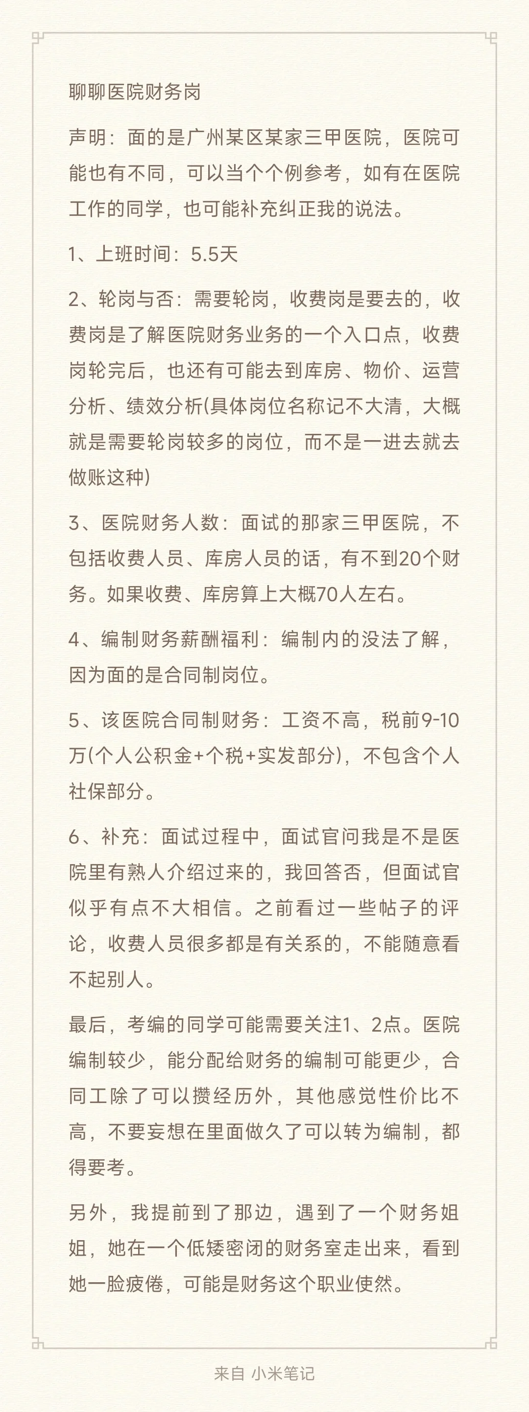 聊聊医院的财务岗 声明:面的是广州某区某家三甲医院,医院可能也有不同,可以当个个例参考,并不代表全部,如有在医院工作的同学,也可能补充纠正我的说法。 1、上班时间:5.5天 2、轮岗与否:需要轮岗,收费岗是要去的,收费岗是了解医院财务业务的一个入口点,收费岗轮完后,也还有可能去到库房、物价、运营分析、绩效分析(具体岗位名称记不大清,大概就是需要轮岗较多的岗位,而不是一进去就去做账这种) 3、医院财务人数:面试的那家三甲医院,不包括收费人员、库房人员的话,有不到20个财务。如果收费、库房算上大概70人左右。 4、编制财务薪酬福利:编制内的没法了解,因为面的是合同制岗位。 5、该医院合同制财务:工资不高,税前9-10万(个人公积金+个税+实发部分),不包含个人社保部分。 6、补充:面试过程中,面试官问我是不是医院里有熟人介绍过来的,我回答否,但面试官似乎有点不大相信。之前看过一些帖子的评论,收费人员很多都是有关系的,不能随意看不起别人。 最后,医院编制较少,能分配给财务的编制可能更少,合同工除了可以攒经历外,其他感觉性价比不高,不要妄想在里面做久了可以转为编制,都得要考。 另外,我提前到了那边,遇到了一个财务姐姐,她在一个低矮密闭的财务室走出来,看到她一脸疲倦,可能是财务这个职业使然。 -- 解释:我说的合同工,可以等同以前的非编制合同工,现在医院正规招考(笔试+面试)新招聘的人员,很多都按照新政策,即定编定岗不定人,但待遇也是跟编制的一样,虽然签的是劳动合同,但这个在我眼里不叫合同工。定义不一样。所以不要说为啥这边三甲的财务工资那么低,因为我说的这个就是一个纯纯只需要面试就可以去的编外合同工,再理解不了,那可以理解成接近劳务派遣的那种岗位了。 #事业单位考试 #财务 #医院财务 |