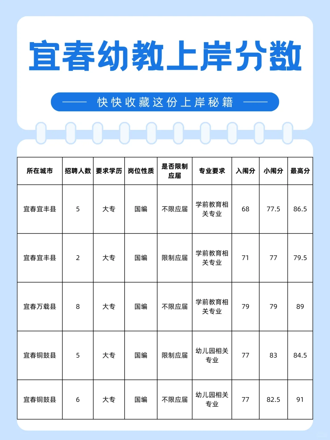 23年,宜春幼教招聘集中在万载、铜鼓、宜丰县,招聘岗位不算多,自然分数也不会太低,进面分都在70+,24年想上岸目标分数也是在80+