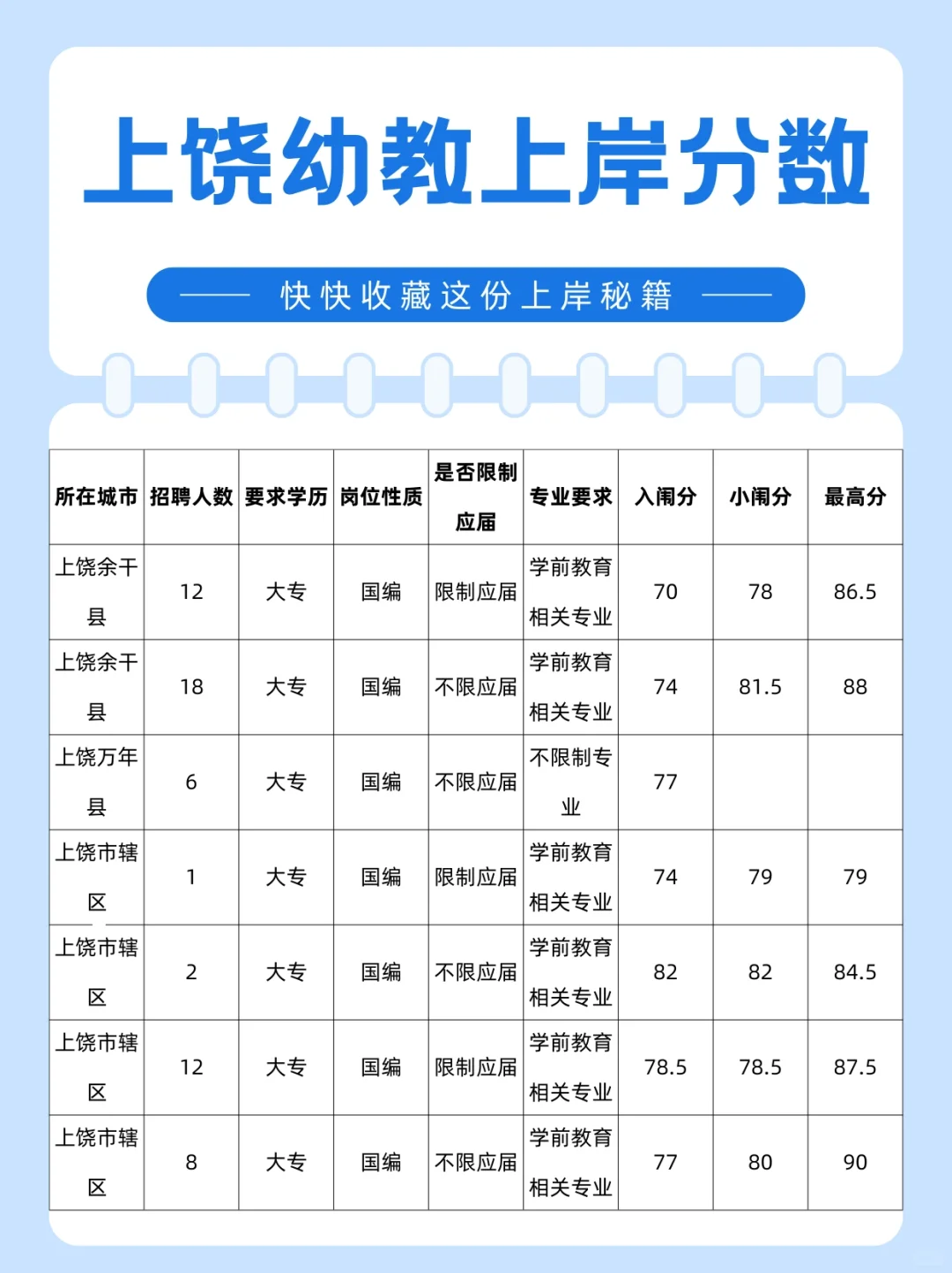 23年,上饶幼教的岗位主要在余干县和市区,且都是国编岗位,虽然招的人都比较多,但是小闱分确都在80左右,这意味着24年想要上岸,目标分数就得是80+