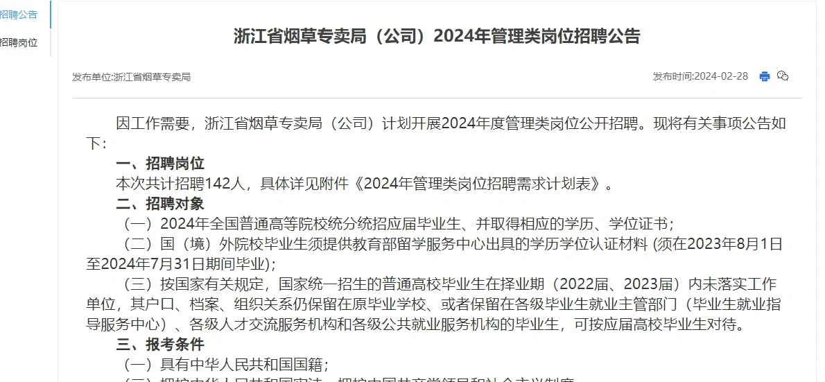 久等的2024浙江烟草专卖局终于出公告啦! 本次浙江烟草专卖局开展2024年度管理类岗位公开招聘 共计招聘142人 招聘对象: (一)2024年全国普通高等院校统分统招应届毕业生、并取得相应的学历、学位证书; (二)国(境)外院校毕业生须提供教育部留学服务中心出具的学历学位认证材料 (须在2023年8月1日至2024年7月31日期间毕业); (三)按国家有关规定,国家统一招生的普通高校毕业生在择业期(2022届、2023届)内未落实工作单位,其户口、档案、组织关系仍保留在原毕业学校、或者保留在各级毕业生就业主管部门(毕业生就业指导服务中心)、各级人才交流服务机构和各级公共就业服务机构的毕业生,可按应届高校毕业生对待。 报名 1.报名程序:应聘人员登录浙江烟草外网(https://zjyc.tobacco.gov.cn/),点击“人才招聘”栏目进入人才招聘系统,注册登录,录入个人信息后选择相应岗位进行报考,并下载求职应聘表、前往校招现场或报考单位初面确认。未经所报单位初面确认的,网上报名无效。报名初面确认截止至2024年3月29日(注:个人信息将作为资格审核的依据,务必真实、完整填写) 。 2.报考须知:应聘人员应以即将获得的最高学历、学位证书所对应的专业报考。属于留学回国人员的,应按照教育部留学服务中心学历认证的专业报考。报考岗位专业参照《2024年浙江省公务员录用考试专业参考目录》。应聘人员须如实、完整、准确、规范填写报考信息,包括教育经历、家庭成员、工作经历、实践经历、获奖情况及惩处信息等,应聘人员只填写个人信息,未选择相应岗位报考的,报名无效;且在本公告的招聘岗位中,只能选择一个招聘岗位进行报名,多报无效。 需要了解更多信息可以咨询噢~烟草待遇可谓是很赞的! #招聘 #烟草招聘 #烟草考试 #烟草局 #央国企 #浙江烟草 #浙江烟草考试 #浙江烟草管理岗 #浙江烟草专卖局 #浙江烟草招聘 #烟草专卖局 |