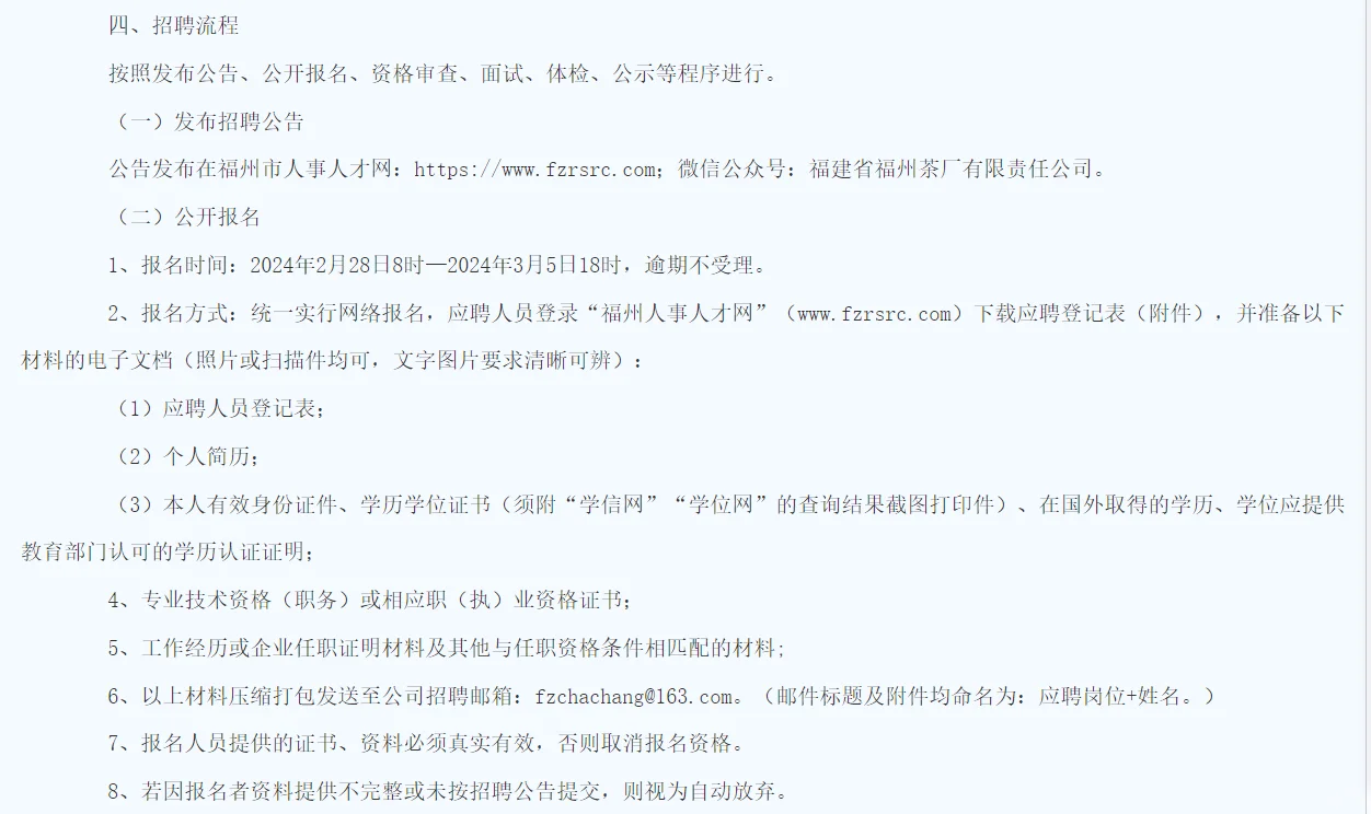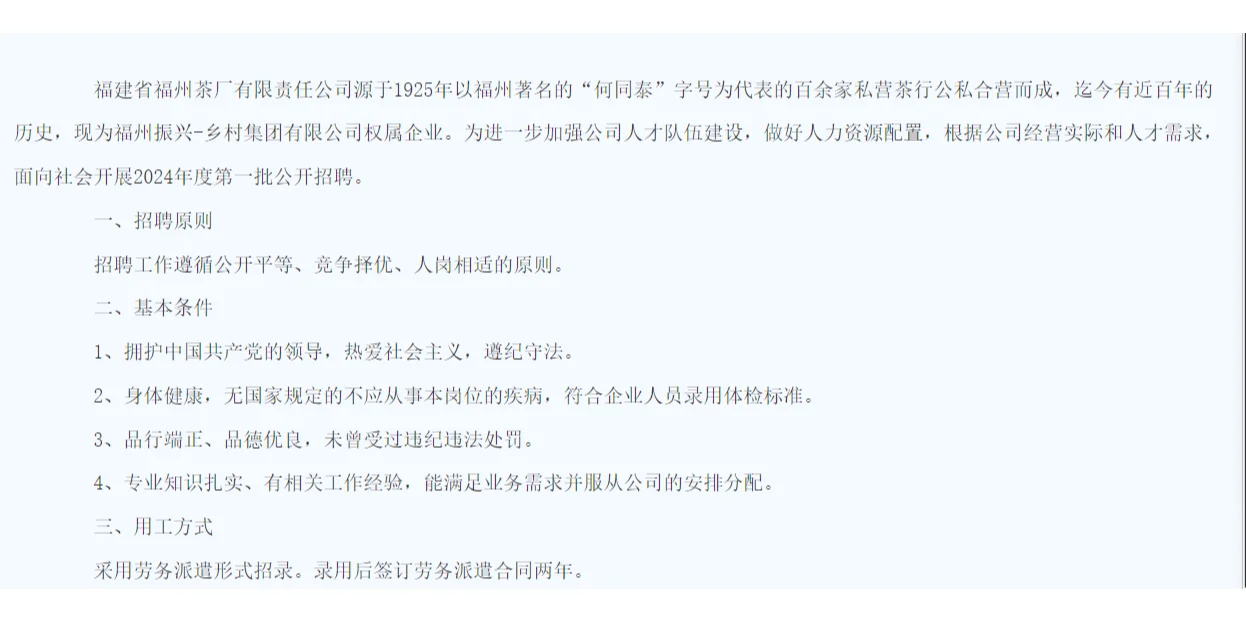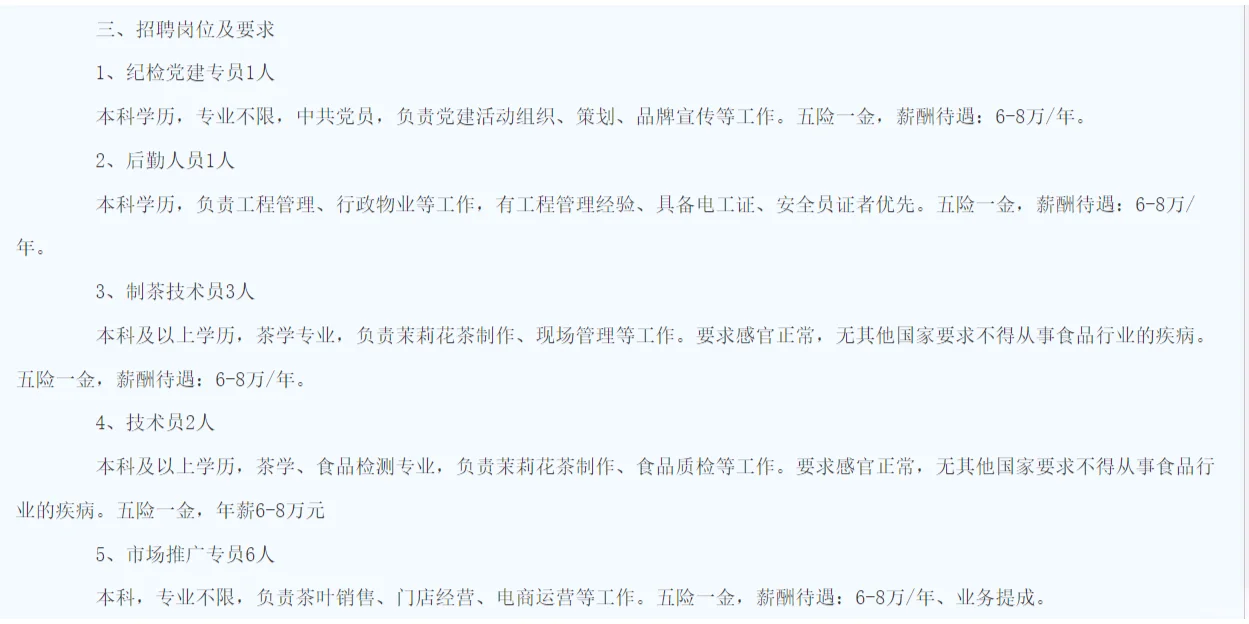 招聘纪检、后勤、制茶、技术员、市场推广等13名员工,薪酬待遇6-8万/年,均采用劳务派遣形式(注意)。