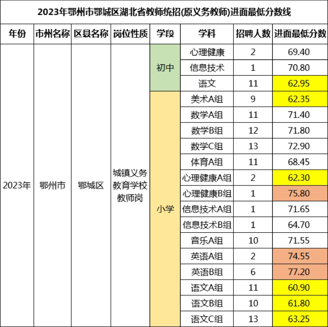 湖北中小学教师招聘考试2023年鄂州市初中语文,小学数学语文最低进面分数线