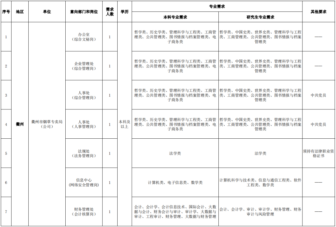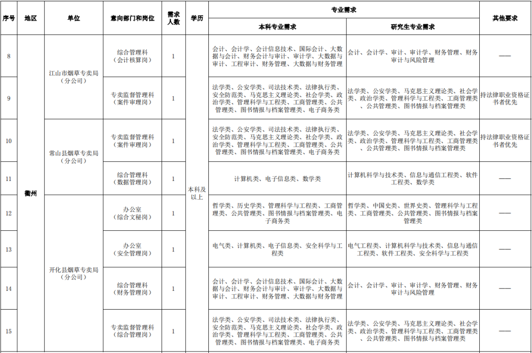 因工作需要,浙江省烟草专卖局(公司)计划开展2024年度管理类岗位公开招聘。现将有关事项公告如下: 一、招聘岗位 本次共计招聘142人,具体详见附件 2024年招聘计划需求表(管理类)2024022715040650974.pdf 衢州15人岗位 ![]() ![]() 二、招聘对象 (一)2024年全国普通高等院校统分统招应届毕业生、并取得相应的学历、学位证书; (二)国(境)外院校毕业生须提供教育部留学服务中心出具的学历学位认证材料 (须在2023年8月1日至2024年7月31日期间毕业); (三)按国家有关规定,国家统一招生的普通高校毕业生在择业期(2022届、2023届)内未落实工作单位,其户口、档案、组织关系仍保留在原毕业学校、或者保留在各级毕业生就业主管部门(毕业生就业指导服务中心)、各级人才交流服务机构和各级公共就业服务机构的毕业生,可按应届高校毕业生对待。 三、报考条件 (一)具有中华人民共和国国籍; (二)拥护中华人民共和国宪法,拥护中国共产党领导和社会主义制度; (三)具有良好的政治素质和道德品行; (四)具有正常履行职责的身体条件和心理素质; (五)具有良好的学习能力、语言表达能力和沟通协调能力; (六)年龄一般为28周岁以下(1996年1月1日及以后出生),硕士及以上学历人员年龄放宽至30周岁以下(1994年1月1日及以后出生)。 四、报考程序 (一)报名 1.报名程序:应聘人员登录浙江烟草外网(https://zjyc.tobacco.gov.cn/),点击“人才招聘”栏目进入人才招聘系统,注册登录,录入个人信息后选择相应岗位进行报考,并下载求职应聘表、前往校招现场或报考单位初面确认。未经所报单位初面确认的,网上报名无效。报名初面确认截止至2024年3月29日(注:个人信息将作为资格审核的依据,务必真实、完整填写) 。 2.报考须知:应聘人员应以即将获得的最高学历、学位证书所对应的专业报考。属于留学回国人员的,应按照教育部留学服务中心学历认证的专业报考。报考岗位专业参照《2024年浙江省公务员录用考试专业参考目录》。应聘人员须如实、完整、准确、规范填写报考信息,包括教育经历、家庭成员、工作经历、实践经历、获奖情况及惩处信息等,应聘人员只填写个人信息,未选择相应岗位报考的,报名无效;且在本公告的招聘岗位中,只能选择一个招聘岗位进行报名,多报无效。 (二)资格审核 根据初面情况和资格审核情况,对应聘人员进行资格筛选,择优确定笔试人员名单,报名人数与岗位需求人数比例低于1:3的岗位,将调减该岗位招聘计划。 (三)笔试 笔试统一组织实施,考试科目为综合能力测试。笔试时间、地点另行通知。根据试卷难易程度视情确定最低分数线,未达到最低分数线的不进入面试环节。 (四)面试 1.根据笔试成绩,按照招聘岗位人数1:3的比例确定参加面试人员名单,最后一名笔试成绩出现并列的,一并进入面试。 2.面试前统一对参加面试人员进行现场资格复审。主要审查下列资料: 2024年全国普通高等院校统分统招应届毕业生需提供就业推荐表、《全国普通高校毕业生就业协议书》、身份证等相关证件原件和复印件。国(境)外院校毕业生还应提供教育部留学服务中心出具的境外学历、学位认证书。 2022届、2023届在择业期内未落实就业的毕业生需提供身份证、毕业证、学位证原件和复印件,无社保缴费记录证明等未落实就业的证明材料。 证件(证明)不全或所提供的证件(证明)与报考资格不符的,不得参加面试。本人未按规定时间、地点参加资格复审的,视作放弃面试。 3.面试采取统一命题。 4.面试前获得面试资格人员,确认不参加面试的,在该岗位的笔试成绩合格人员当中从高到低予以递补。 5.未按规定时间、地点参加资格复审或资格复审不合格的,不再替补。 6.面试成绩满分为100分,合格分为60分。面试不合格的不能列入考察、体检对象。 (五)成绩排名 1.成绩计算 综合成绩=笔试成绩×50%+面试成绩×50% 2.成绩排名。按照综合成绩从高到低进行排序,综合成绩相同的,按照面试成绩排名。 (六)考察与体检 根据考生综合成绩,按照招聘岗位人数1:1比例确定考察、体检对象。考察内容主要包括人选的政治素质、道德品行、能力素质、心理素质、学习和工作表现、遵纪守法、廉洁自律、岗位匹配度以及是否需要回避等方面的情况。体检标准参照《公务员录用体检通用标准(试行)》等有关规定执行。放弃考察、体检,或考察、体检不合格的,按岗位综合成绩,由高到低予以递补。 (七)公示 招聘结果在国家烟草专卖局外网(www.tobacco.gov.cn)和浙江烟草外网(https://zjyc.tobacco.gov.cn/)人才招聘栏目进行公示。公示期为5个工作日。 (八)录用 公示期满,对没有问题或者反映问题不影响录用的,由各用人单位按照规定程序办理录用手续;对有严重问题并查有实据的,不予录用;对反映有严重问题,但一时难以查实的,暂缓录用,待查实并做出结论后再决定是否录用。 五、回避事项 应聘者不得报考录用后即构成干部任职回避情形的岗位,也不得报考与本人有夫妻关系、直系血亲关系、三代以内旁系血亲关系以及近姻亲关系的人员担任领导成员的用人单位的岗位。如有故意隐瞒的,一经查实,取消应聘资格,已签订劳动合同或被录用的,解除劳动关系。 六、特别提示 (一)本公告报名网址(https://zjyc.tobacco.gov.cn/)是应聘人员报名的唯一网址,未委托任何机构进行招聘信息转载,应聘者通过其他链接网站投递的
