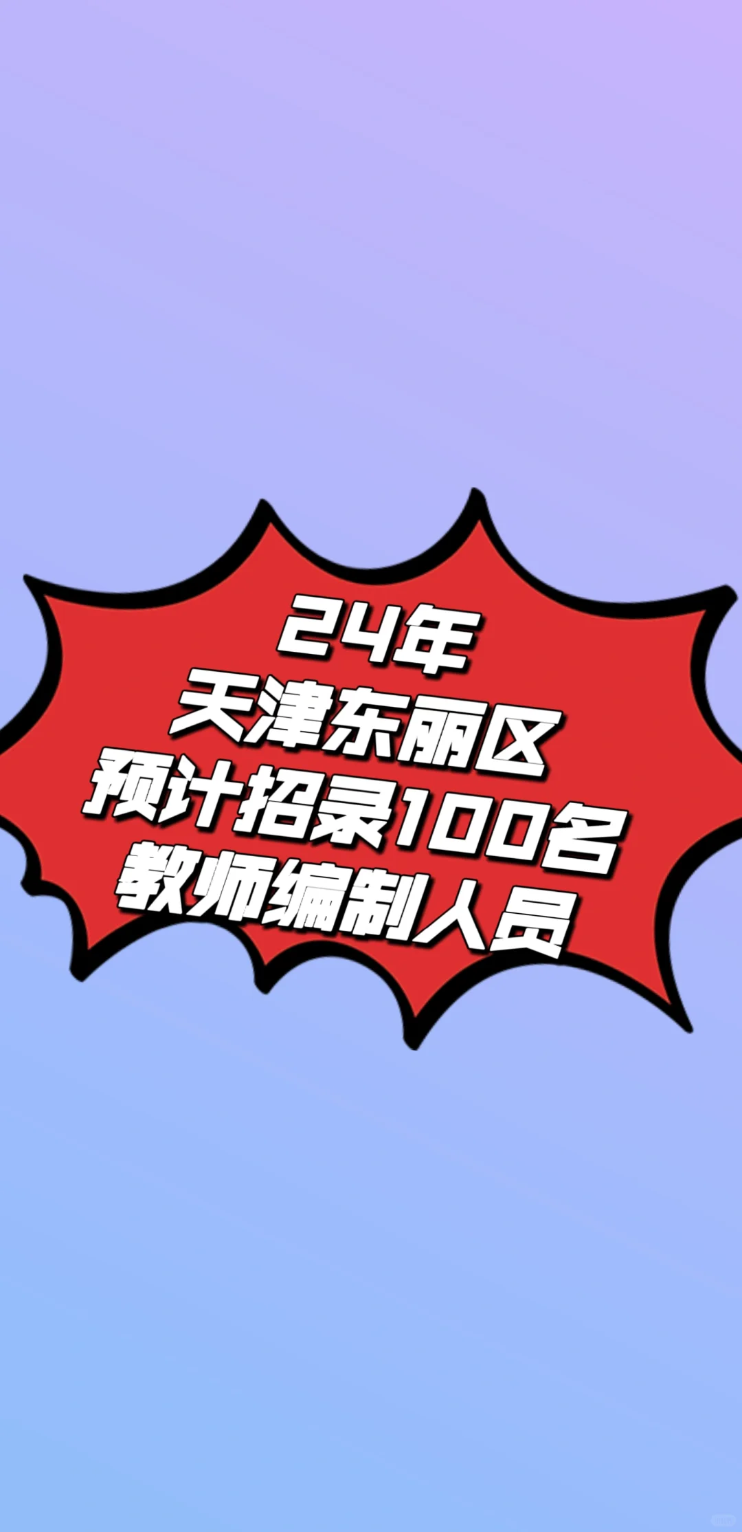 哈喽,各位同学,天津东丽区出公告了,招录100名教师编制人员,东丽的珍题“si” 我哈,加油!24年教师编制离我们越来越近了