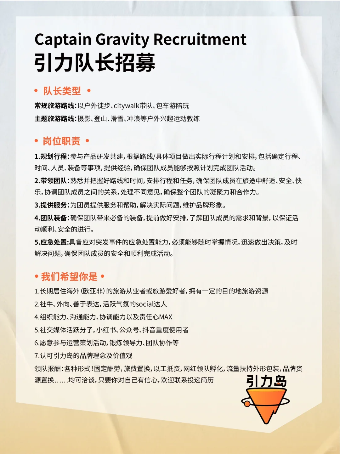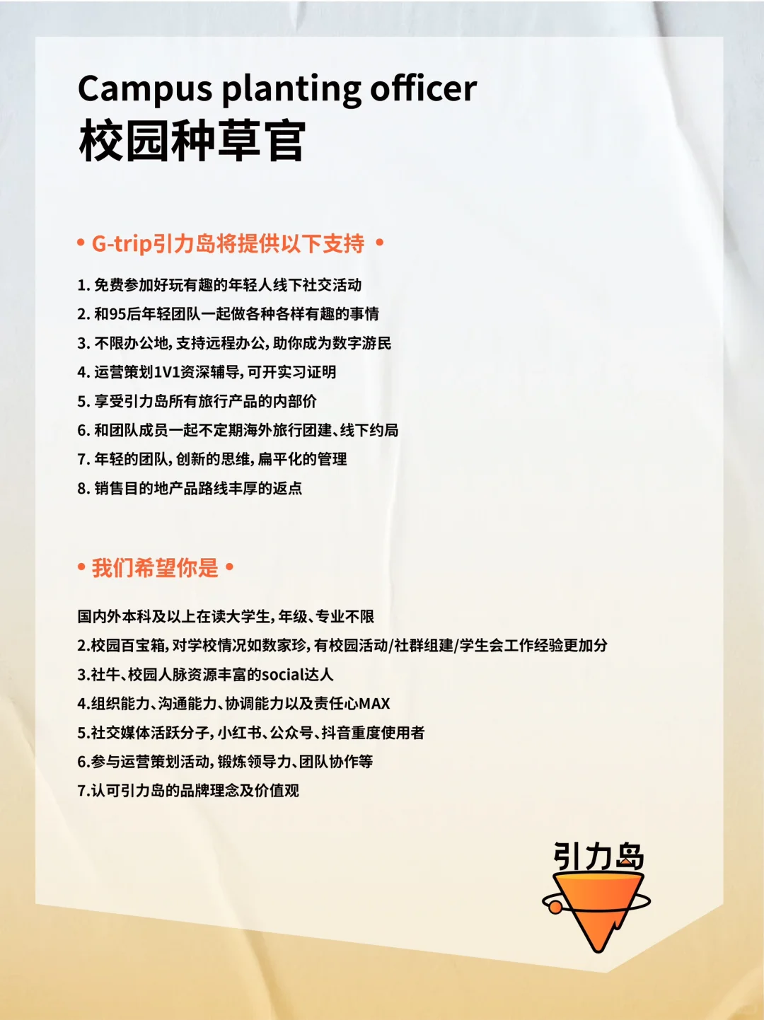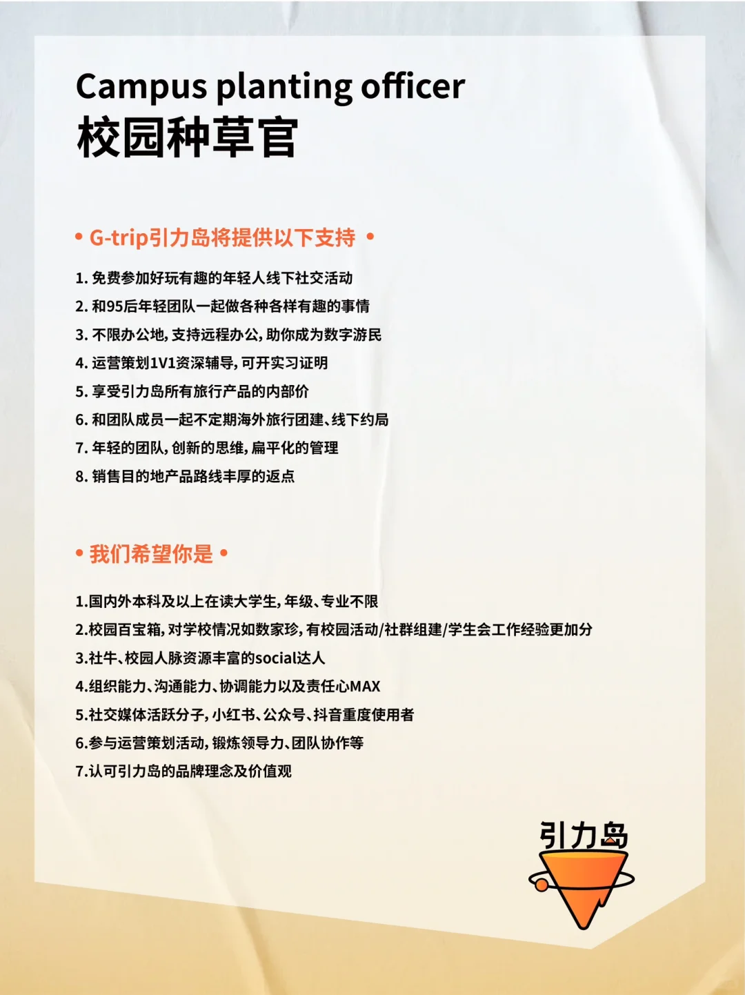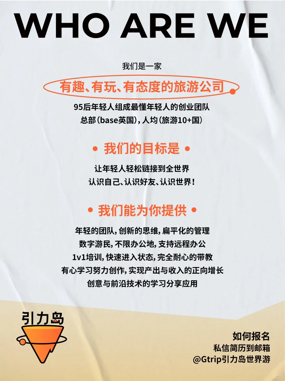 招聘|加入有趣的年轻旅行品牌💼可远程办公 第四轮招聘开启啦! 大家好,我们是Gtrip引力岛,这是一座由旅游狂热者/数字游民/旅游创业者打造的年轻人的理想国! 💌我们的目标是让年轻人轻松链接到全世界,认识自己、认识好友、认识世界。 . 👉🏻我们将提供以下支持: 1. 线上工作,不限办公地💻 2. 95后年轻团队创新思维 3. 拒绝职场pua的扁平管理 4. 引力岛所有旅行产品的内部价 5. 好玩有趣的年轻人线下社交活动 6. 不定期海外旅行团建、线下约局 · 👉🏻希望你是: 1. 认可引力岛的品牌理念 2. 较真且执行力超高的工作态度 3. 情绪稳定,高能量磁场,不玻璃心 4. 长期加入创业团队的准备 . 如果你的才华渴望被珍惜、被理解,那么快来与我们相遇吧,我们尊重每一个声音,深知创新来自不同的思考和观点。 欢迎岛民们的投递与加入! 📮投递简历备注格式见p2 #招聘#数字游民 |