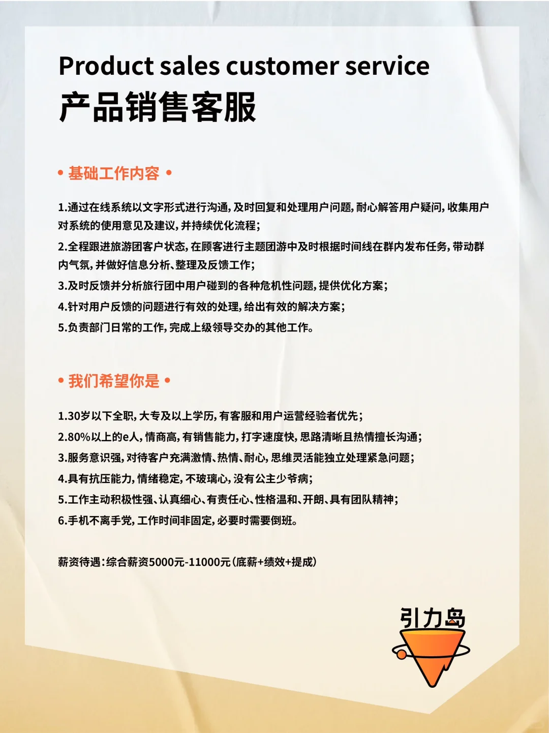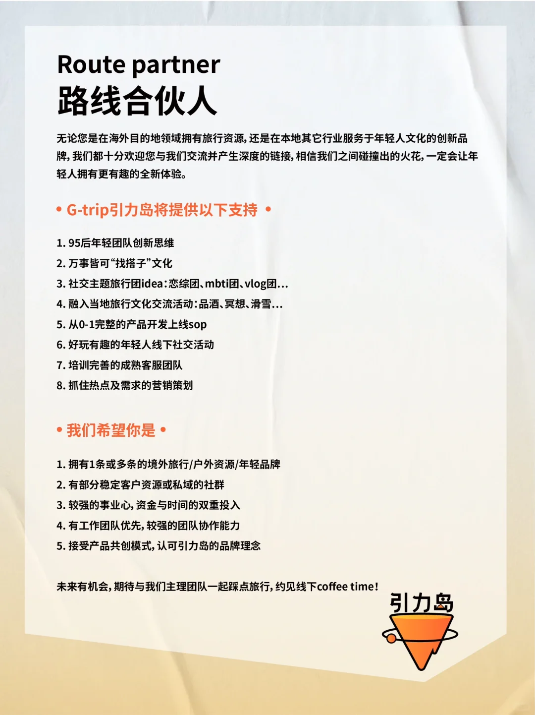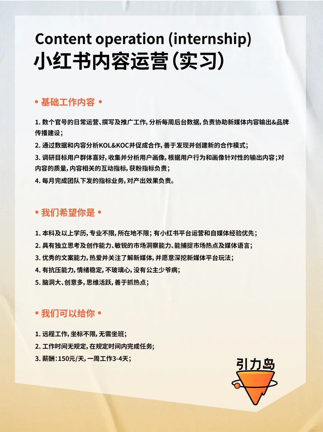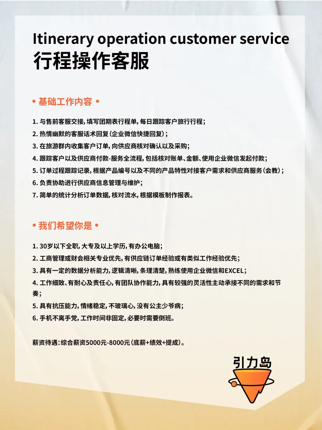 招聘|加入有趣的年轻旅行品牌💼可远程办公 第四轮招聘开启啦! 大家好,我们是Gtrip引力岛,这是一座由旅游狂热者/数字游民/旅游创业者打造的年轻人的理想国! 💌我们的目标是让年轻人轻松链接到全世界,认识自己、认识好友、认识世界。 . 👉🏻我们将提供以下支持: 1. 线上工作,不限办公地💻 2. 95后年轻团队创新思维 3. 拒绝职场pua的扁平管理 4. 引力岛所有旅行产品的内部价 5. 好玩有趣的年轻人线下社交活动 6. 不定期海外旅行团建、线下约局 · 👉🏻希望你是: 1. 认可引力岛的品牌理念 2. 较真且执行力超高的工作态度 3. 情绪稳定,高能量磁场,不玻璃心 4. 长期加入创业团队的准备 . 如果你的才华渴望被珍惜、被理解,那么快来与我们相遇吧,我们尊重每一个声音,深知创新来自不同的思考和观点。 欢迎岛民们的投递与加入! 📮投递简历备注格式见p2 #招聘#数字游民 |