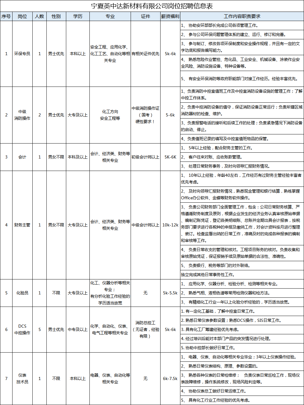应聘报名 公司地址:宁夏银川市宁夏宁东新材料化工园区 备注:公司目前只开设汉餐,住宿在宁东镇(有通勤车接送) 联系方式:18995183748 (王女士) (简历命名格式:姓名+岗位+电话) 邮箱地址:516215489@qq.com |
