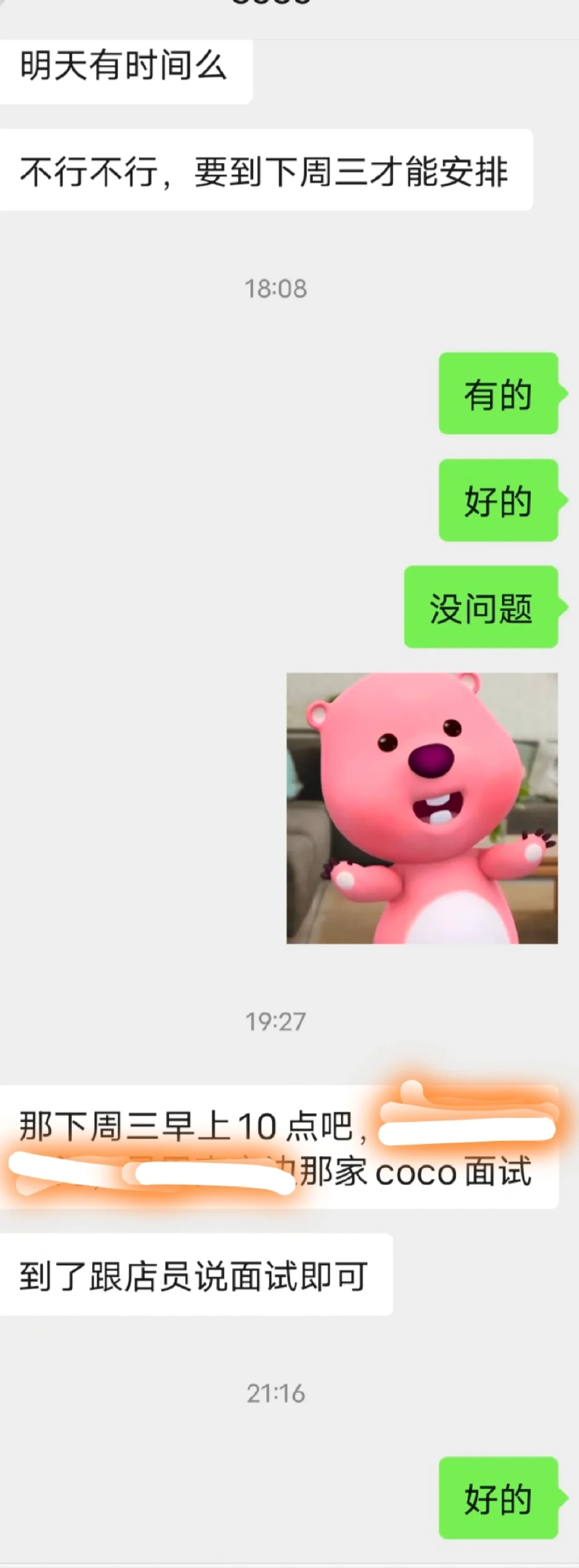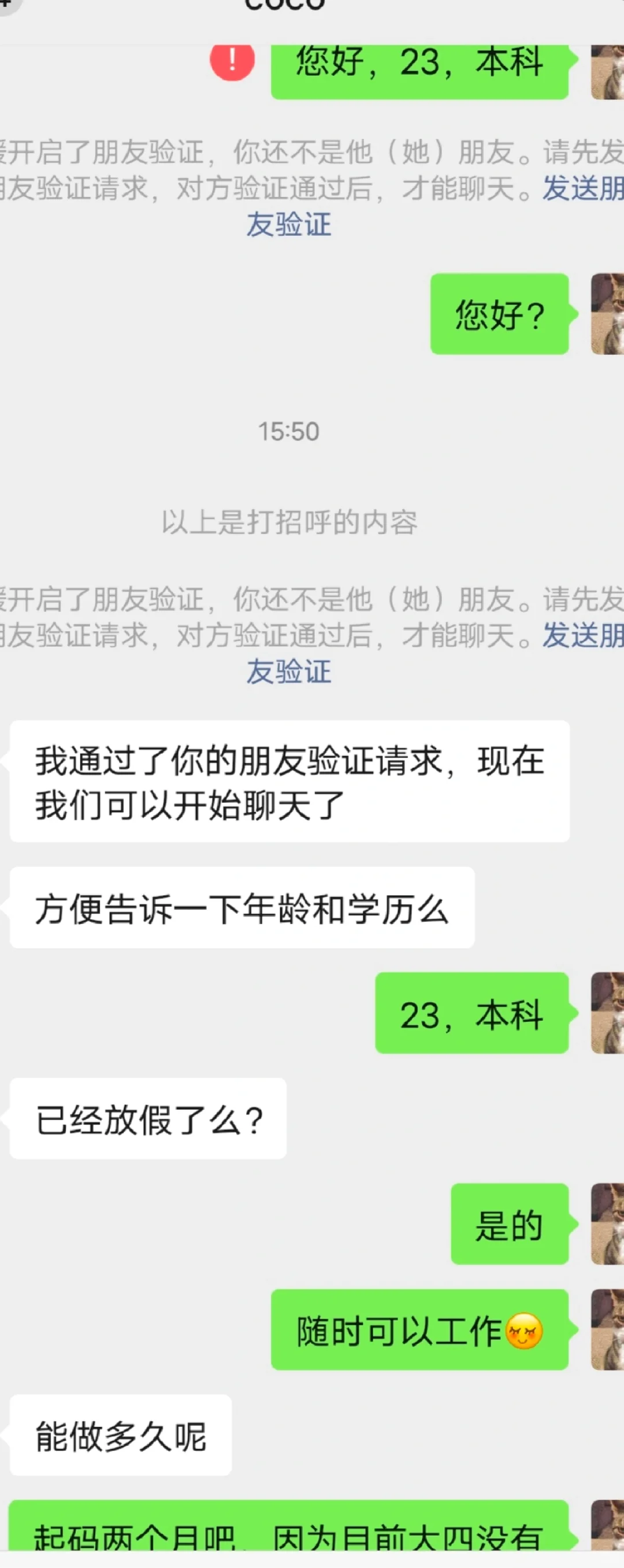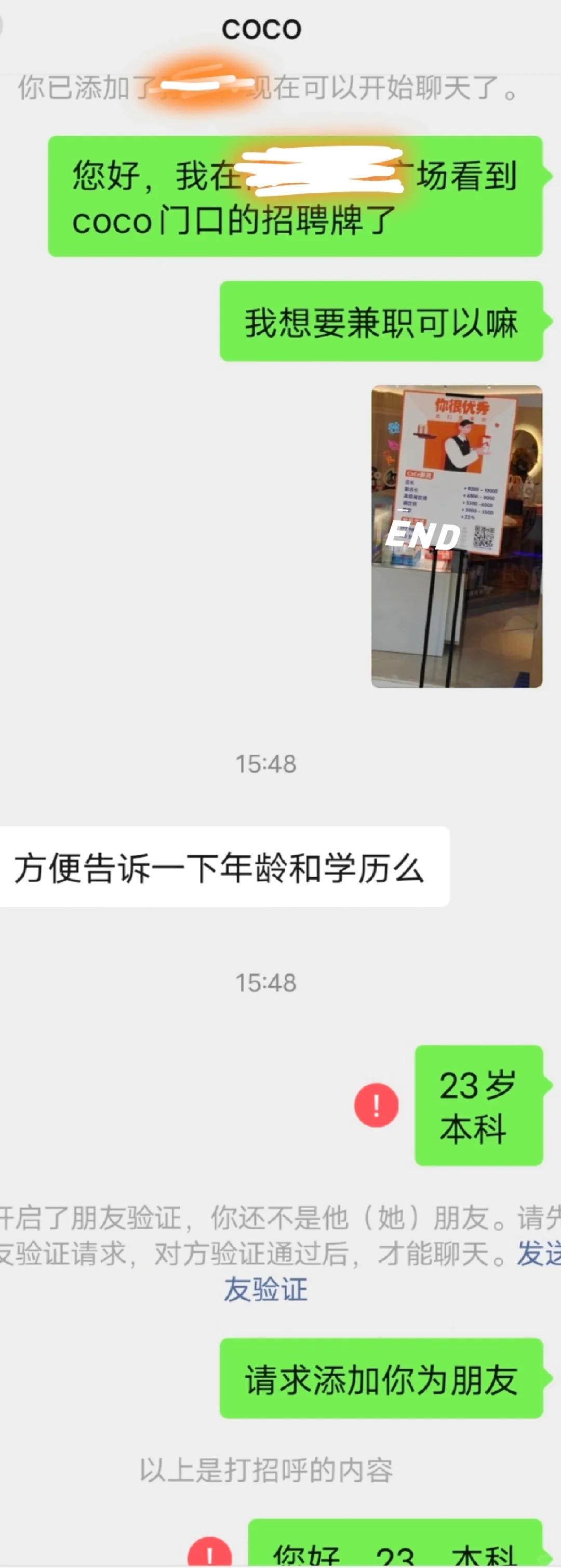 CoCo招人咋这么奇怪嘞 这个人应该是coco的督导,我前几天在某求职软件上也有看到她发的招聘,当时在软件里给她发消息已读不回,我和男朋友一商讨以为是招满了。 今天逛街看到店门口大大的招聘板,就按上面号码添加绿色通道了,一看名字,竟然和求职软件上已读不回的是同一个。(奇怪点1) 添加好友是自动同意的,应该是她设置的问题(也许是或其他)发消息好好的突然开启好友认证了,就很奇怪。(奇怪点2) 后来她跟我大体说了一下是轮班制啥的,春节不休息啥的,我就主动问她什么时候可以开始工作,然后说需要先面试。 为啥是去店里找店员进行面试呀?(奇怪点3)我不太了解,有没有姐妹知道具体面试啥,之前刷到有姐妹说面试一天纯当免费劳动力了,然后还不合格[汗颜R]有点担心被当骡子[笑哭R] #CoCo都可 #奶茶兼职 #面试 #宝宝辅食 |