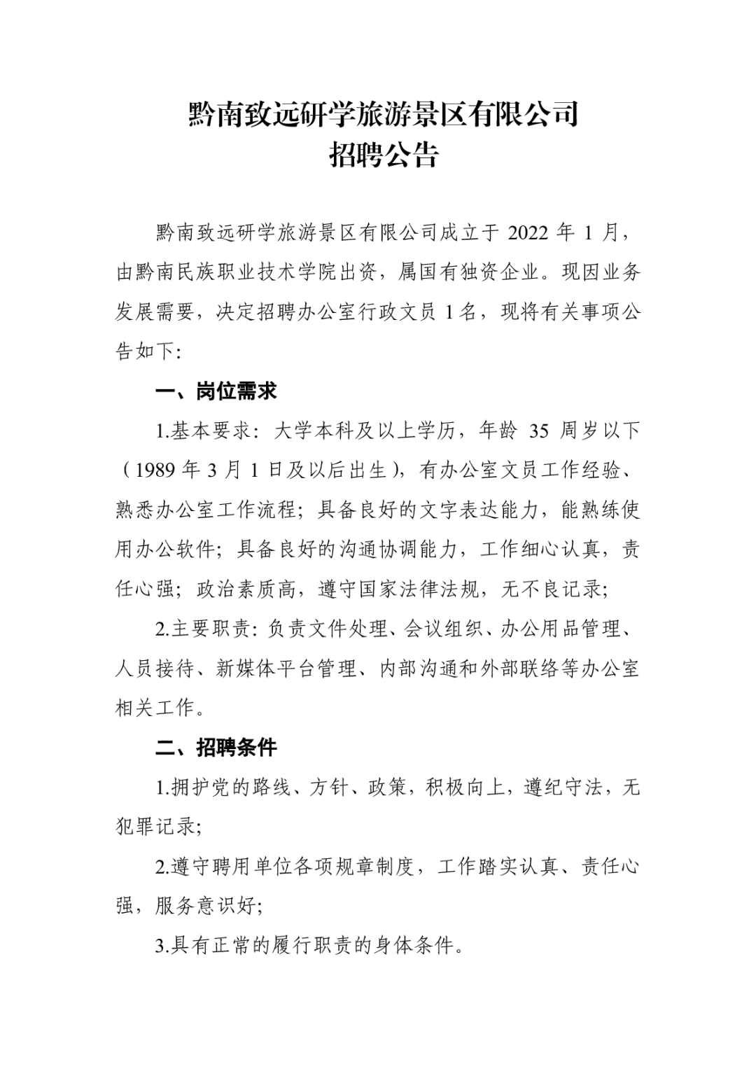 2024年黔南致远研学旅游景区有限公司招聘公告