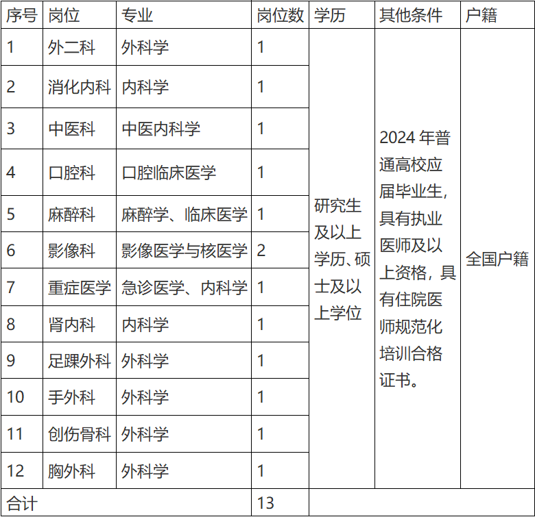点击关注"宁波招聘号" 一、招聘单位简介 宁波市第九医院始创于1952年,是一所集医疗、教学、科研、康复及预防保健为一体的二级甲等综合性医院。医院占地75亩,建筑面积近10万平方米,开放床位700张,现有在职职工773人,高级职称154人,博士1名,硕士55名。2019年3月,牵头成立宁波市第九医院医疗健康集团。2023年10月,冠名“宁波市江北区红十字医院”。 医院以“仁泽、医粹、尚新”为核心的价值观,以患者满意、员工幸福为办院宗旨,目前医院正以打造宁波姚江北岸医学中心为目标,努力争创三级乙等医院。 二、招聘岗位和数量 具体招聘专业、数量、对象范围和学历、要求等详见附件1。 三、招聘对象 1.国内2024年(含2022年、2023年)普通高校硕士研究生及以上学历学位毕业生。 2.国(境)外高校2021年10月1日至2024年12月31日毕业的硕士研究生及以上学历毕业生。 定向培养、委托培养须提供委托培养单位同意报考的书面证明。 四、招聘条件 (一)政治合格,遵纪守法,品行端正,无违法违纪行为,热爱医疗卫生事业。 (二)具有招聘岗位所需的专业、学历和专业知识及业务能力等要求;硕士研究生年龄要求1995年2月29日(含)以后出生;博士研究生年龄要求1993年2月29日(含)以后出生。 (三)适应岗位要求的身体条件及其他条件。 (四)根据《浙江省公办高校、公立医院报备员额管理办法(试行)》,宁波市第九医院医疗健康集团总院此次招聘使用事业单位报备员额。 五、招聘程序 (一)报名及资格审查 1.凡符合条件的报考人员通过扫描二维码按提示要求录入个人信息并选择岗位,每人限报一个岗位。报考人员提供的个人信息必须真实有效。网上报名时间:2024年3月11日9时至3月13日16时。