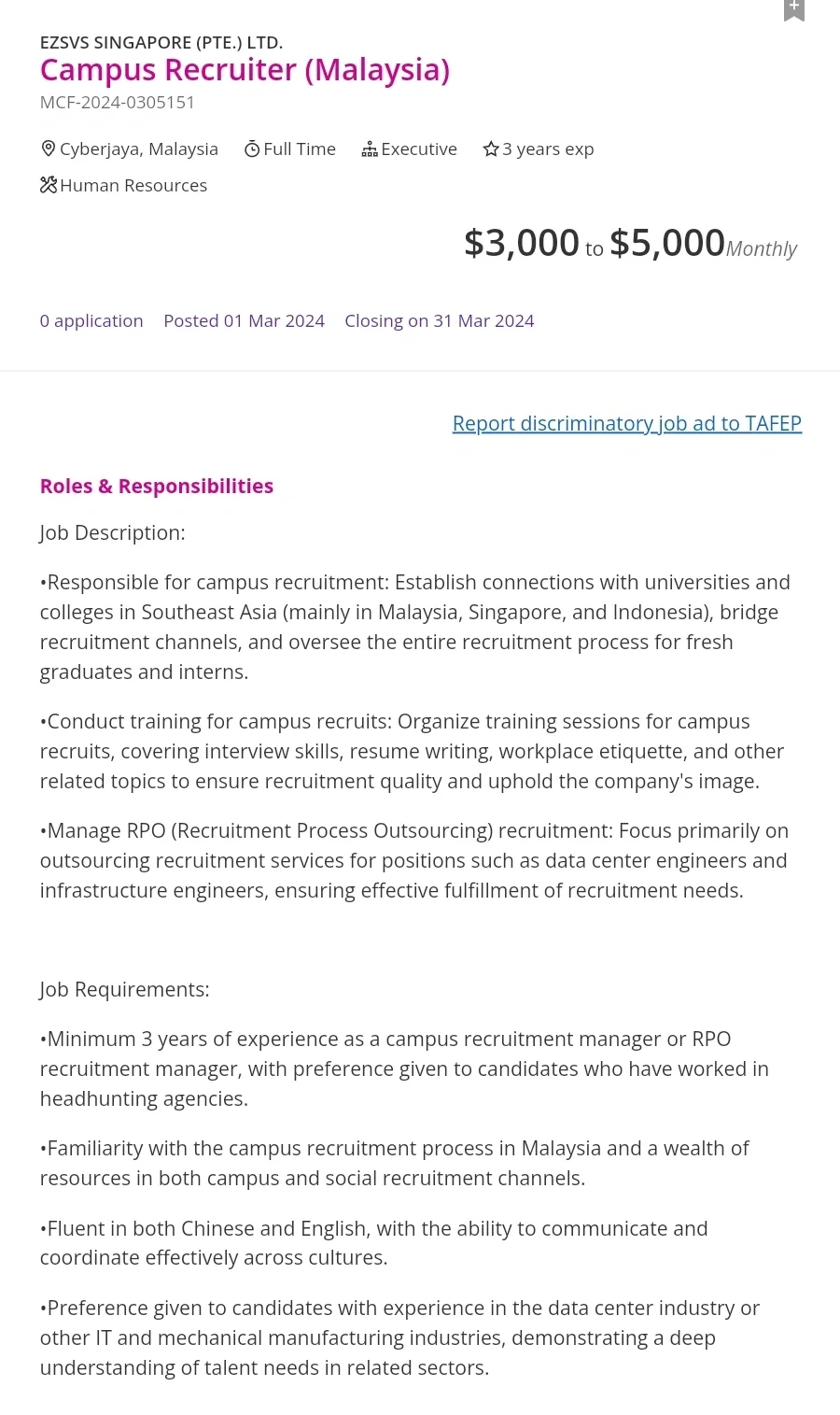 校园招聘人员 职位描述: •负责校园招聘:与东南亚(主要是马来西亚、新加坡、印度尼西亚)高校建立联系,搭建招聘渠道,并监督应届毕业生和实习生的整个招聘流程。 •开展校园招聘培训:组织校园招聘培训,内容涵盖面试技巧、简历撰写、职场礼仪等相关话题,确保招聘质量,维护公司形象。 其他 •管理RPO(招聘流程外包)招聘:主要关注数据中心工程师、基础设施工程师等职位的外包招聘服务,确保有效满足招聘需求。 工作要求: 至少3年校园招聘经理或RPO招聘经理经验,有猎头机构工作经历者优先。 •熟悉马来西亚校园招聘流程,拥有丰富的校园及社会招聘渠道资源。 中英文流利,具有跨文化有效沟通和协调的能力。 •优先考虑具有数据中心行业经验的候选人或 其他IT和机械制造行业,展示了对相关行业人才需求的深刻理解。 #新加坡工作推荐 #新加坡工作 #校园招聘 #工作招聘 #马来西亚工作 #马来西亚工作推荐 |
