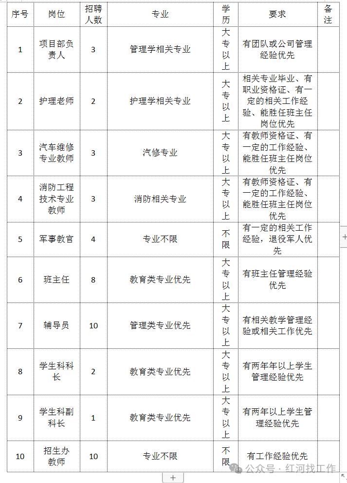 ↑ 点击上方 蓝字 关注我们 据 说 关 注 我 们 的 人 都 找 到 了 好 工 作 云南学星教育咨询有限公司招聘简章云南学星教育咨询有限公司是一家集职业教育、成人教育、学历提升等业务为一体的公司,公司现有职工40余人,为解决市场和相关教学管理工作人员不足问题,现对广大有志之士公开招聘;公司位于北京路延长线,高康服装产业城内,环境优美,与昆明华航技工学校等达成长期合作关系。公司秉承为员工创造一个温馨的家,做到人适其位、位适其才。1.遵纪守法,品行端正,具有良好的职业道德、团队精神和创新意识、愿为学校的改革和发展作出贡献;3.具备从事相关工作的知识水平和能力,岗位所需的任职资格、职业(执业)资格及技能要求,能胜任实际操作课程。1.报名时间:2024年3月1日起至2024年3月15日。2.报名材料:个人简历、毕业证、学位证、职称证书及相应资格证书、所获荣誉证书等有效证件的复印件。3.报名方式:将报名材料以文件夹压缩包形式发送到电子邮箱2358027684@163.com。(文件夹命名为“姓名+应聘岗位+电话”)4.提交审核:报名信息填好后即可提交,公司按照报名条件进行简历审核,择优选取符合条件的人员进行第一轮面试。审核通过的人员将在报名时间截止后三天内通过电子邮件或短信进行回复,未通过审核不做回复,请应聘者及时查看。面试时间:2024年3月16日-17日,具体时间后续进行通知。1.联系电话:赵老师 18387388146(微信同号)或王老师131087374792.电子邮箱:2358027684@163.com面试人员须准备材料如下(面试时请携带以下纸质版材料):教师岗:现场抽题、备课半小时后开始试讲,试讲时间为10-15分钟;由公司总经理、分管领导、人事处组织面试、考核,主要考核相关专业能力及职业道德素养。2.面试结果于面试结束后3个工作日内以短信或电话的方式通知,未通过者将不作任何通知。1.聘用方式:采用全职聘用方式,为公司在职人员签订劳动合同。2.工资结构:基本工资+岗位工资+绩效+各类津贴+话补+课酬+全勤奖,综合工资3.5k-8k(根据岗位和相关课时量定薪),购买五险。3.其他福利:提供教职工宿舍、带薪寒暑假、法定节假日、免费健康体检、培训进修机会等。注意:请各位求职者在求职时需提高警惕,凡涉及收取各种费用或扣押证件;几乎不面试就给出录取通知,且到外地就职的招聘等情况,要仔细辨别,谨防上当受骗。 来源:红河人才网 |