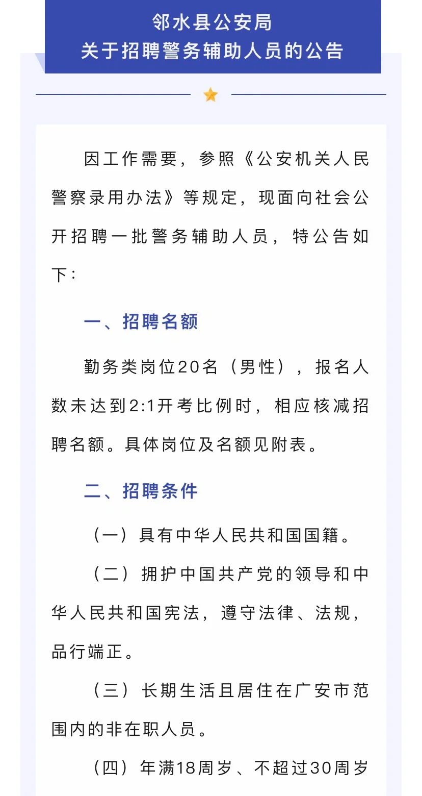 邻水县公安局招聘一批辅助警务人员,勤务类岗位20名(男性)。