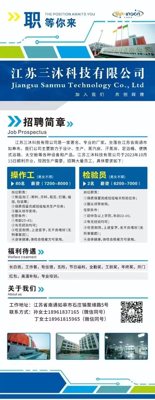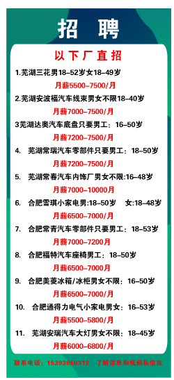 省外优质岗位专区 ![]() 一、江门市新会智能垃圾桶厂 招聘岗位:组装、打包装、注塑、冲压; 工作时间:冲压(自动化)和包装部门长白班、注塑部门两班倒、普通工衣,每天12~13小时; 工厂地址:江门新会区 年龄要求:18~55岁 男女比例:男女比例不限 厂方产品:生产智能垃圾桶 工作环境:空调车间,空调宿舍,普通工衣。 管理费:60元/月; 薪资待遇: 1.组装包装16元/小时,注塑和冲压部门工18元/小时,注塑部夜班补贴10元/晚;注塑和冲压部门综合薪资5500-6500元,包装部门综合工资5000-5800元,有夫妻房(需凭结婚证); 2.伙食宿舍:3元/餐(中晚餐);住宿30元/月;新厂区宿舍4~6人/间,有夫妻房(需凭结婚证),宿舍设有独立卫生间、空调、热水器等,水电费平摊; 3.入职暂时在旧厂区,3月份全部搬迁至新厂区。 面试要求:入职准备身份证原件、复印件2张,照片3张,会写字、会讲普通话,要体检(入职3天后体检,工作满一个月可报销费用)。 辞职要求:正常辞职提前15天申请;入职工作满七天(含七天)以下无薪资,自离无任何薪资,急辞扣300元。 【特别事项】本人有效身份证,大面积纹身不接。 【信誉保障】人走账清,除了工厂扣款外保证绝对不乱扣员工一分钱,有一赔十。 联系方式:李老师15388889811 二、江苏三沐科技有限公司 ![]() (可点击图片放大查看招聘详情) 联系电话:孙女士18961837165 三、安徽企业 ![]() (可点击图片放大查看招聘详情) 联系电话:周老师15393860312 ![]() 来源:保山市人力资源市场 |