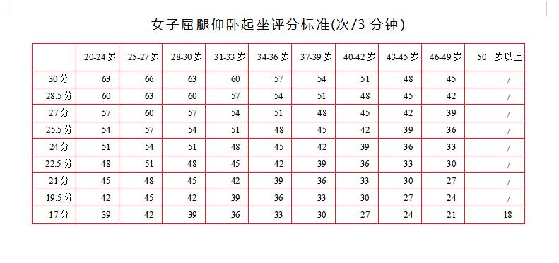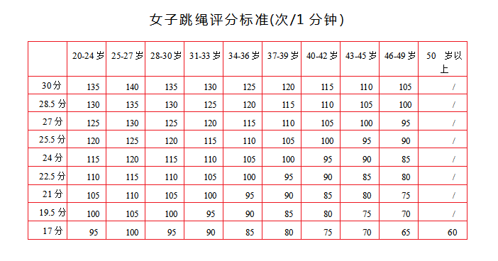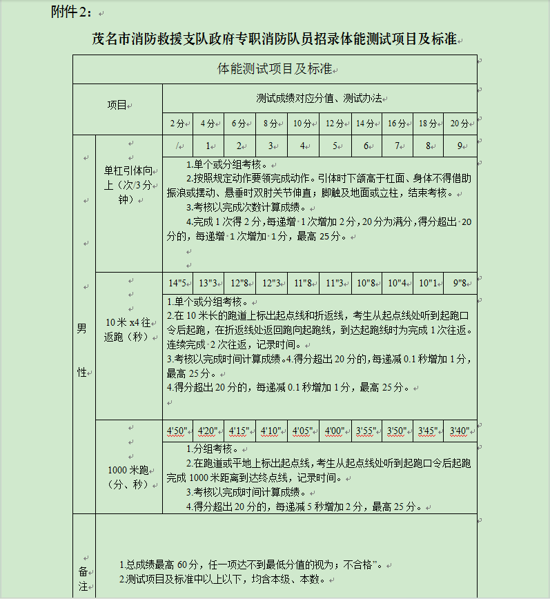 体能考核。资格审查合格的招录对象参加体能测试。男性体能测试项目为:1000米、单杠引体向上、10x4折返跑,单项最高分为25分,总成绩最高60分;女性体能测试项目为女生为屈腿仰卧起坐、跳绳。单项设最高分为30分,总成绩60分,任一单项达不到最低标准的视为“不合格”,予以淘汰。体能测试所有项目均只测试一次。