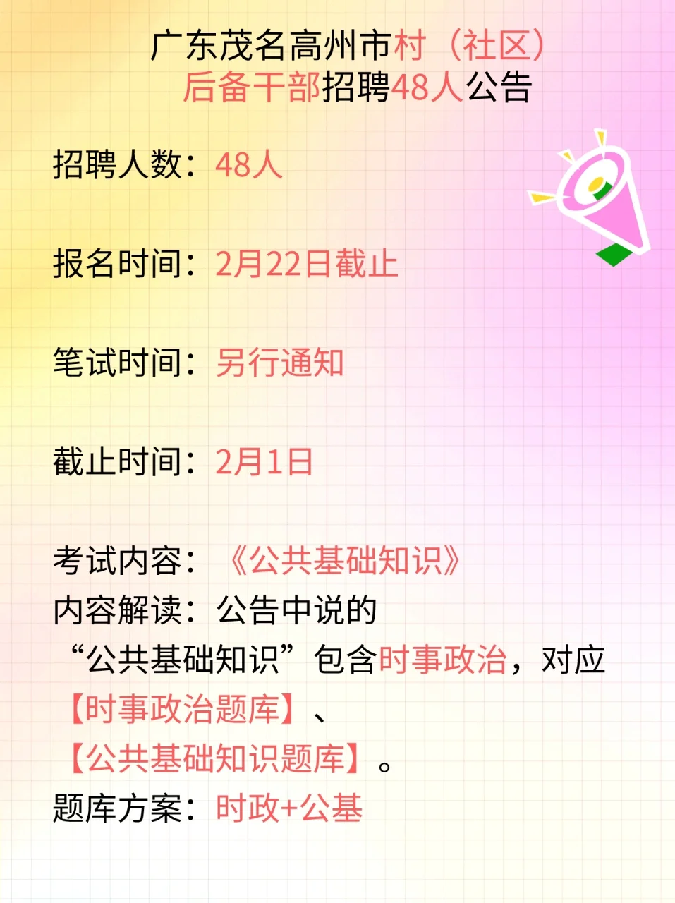 内容解读:公告中说的“公共基础知识”包含时事政治,对应【时事政治题库】、【公共基础知识题库】。