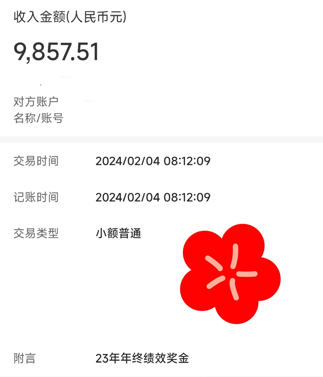 年终奖,来自2023年最后的鼓励。2023年在工作方面算是圆满啦。人无完人,虽然工作方面没有做的十分好,可算是有惊无险,在每个前辈和领导的不断包容之下,虽有磕磕绊绊,但顺利的走完了2023年。