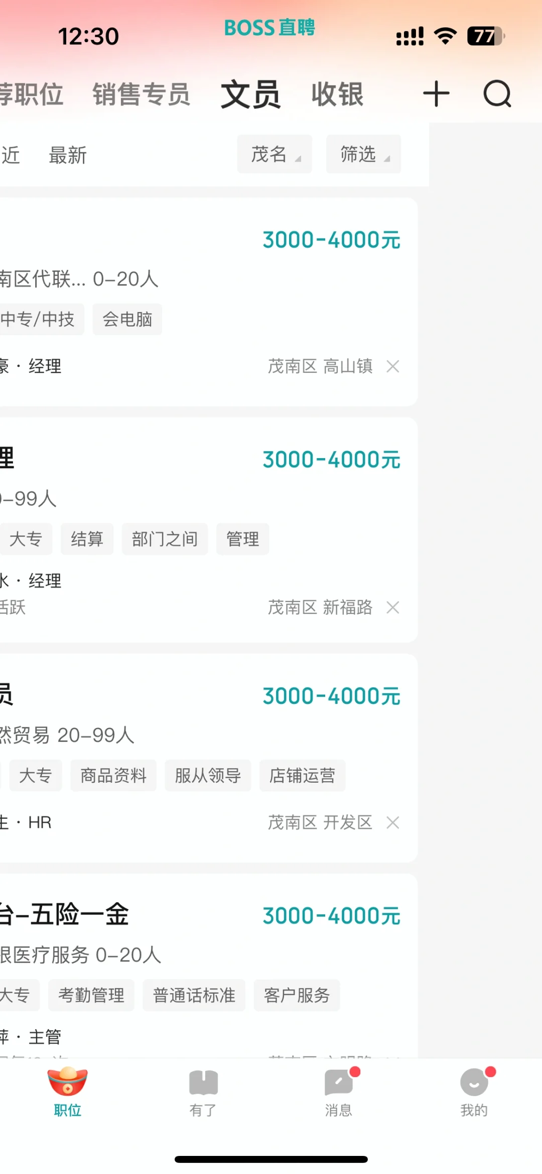 软件上来来去去就是那几家公司,很多已读不回复的,在茂名找工作真的好难。