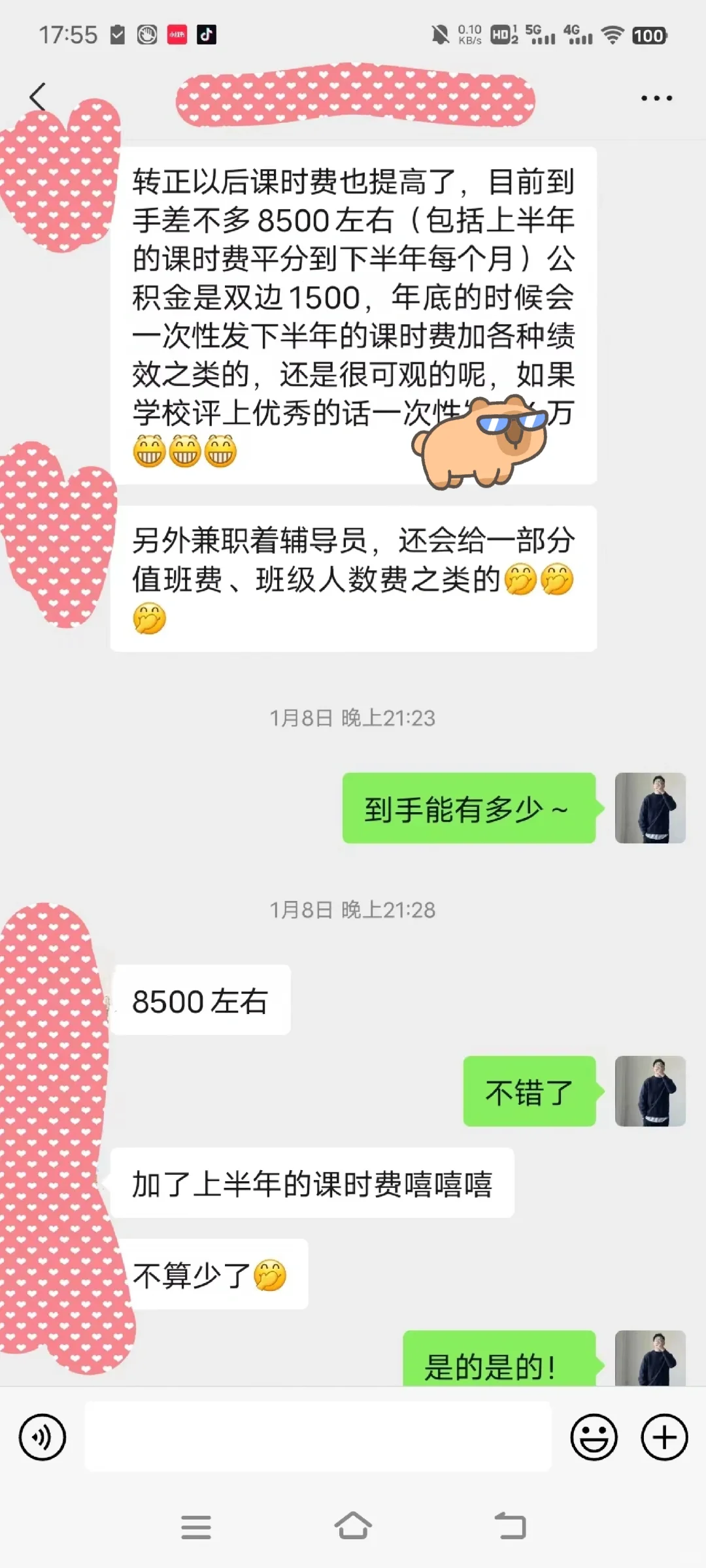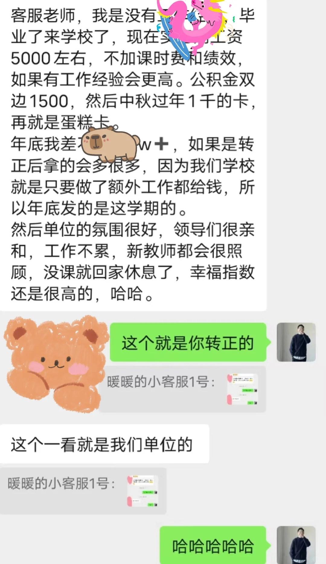 哈哈哈哈哈哈哈!每次看到福利待遇反馈都是开心的!因为真心替大家的努力和付出感到高兴!今年又来给大家打鸡血!其实这个学校的福利待遇之前发过了一次,那时候学生还没转正!工资福利待遇真的平平无奇!过了实习期后真的上了一个新台阶!今年又考上了一个,顺便问了新入职的!所以说新入职的宝子不要着急,咱们这个岗位是专业技术岗,越老越香喷喷!