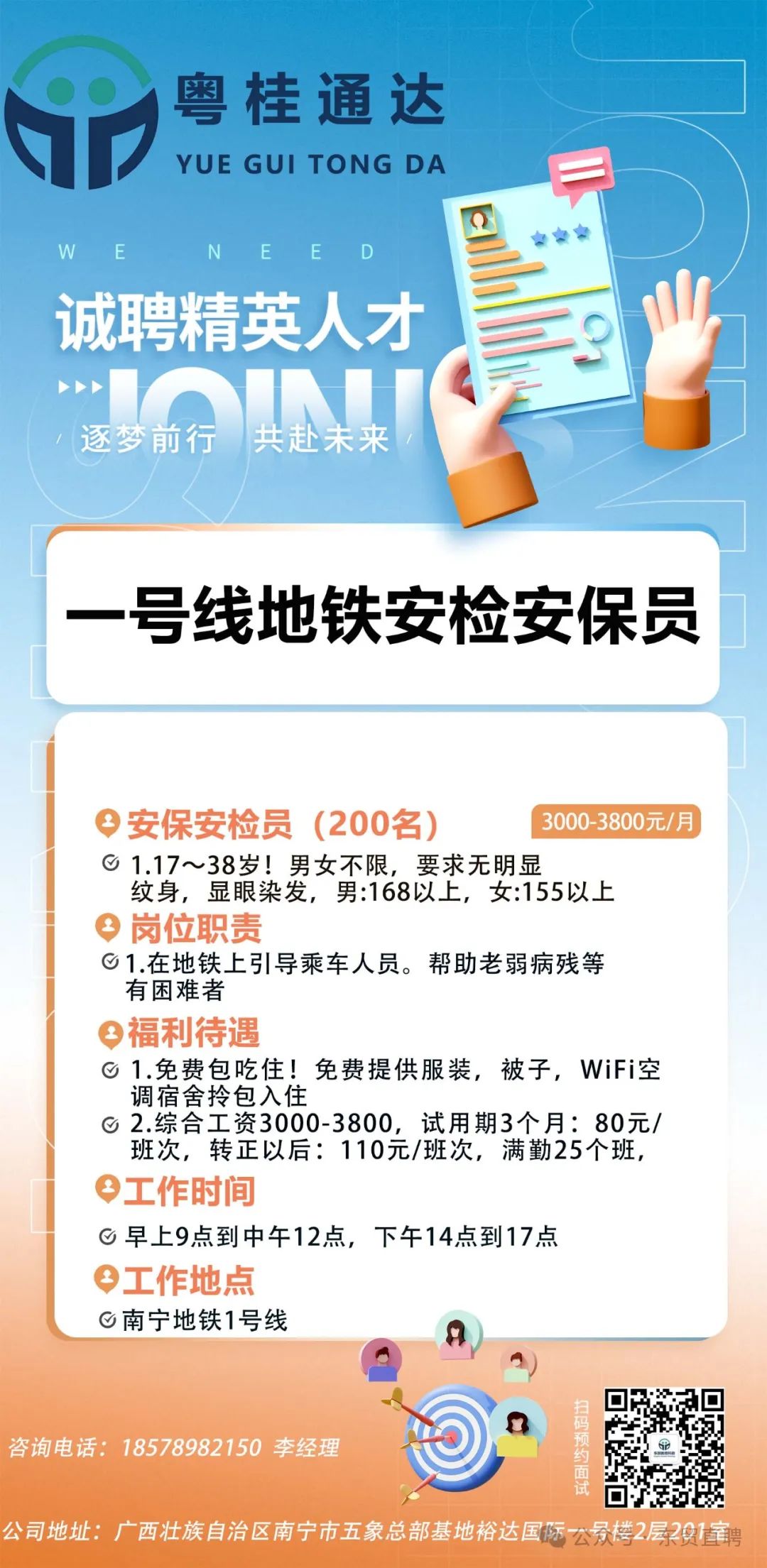 【岗位推荐】南宁地铁1号线招安检员、安保员,男女不限,包吃包住,福利待遇好!名额有限!!