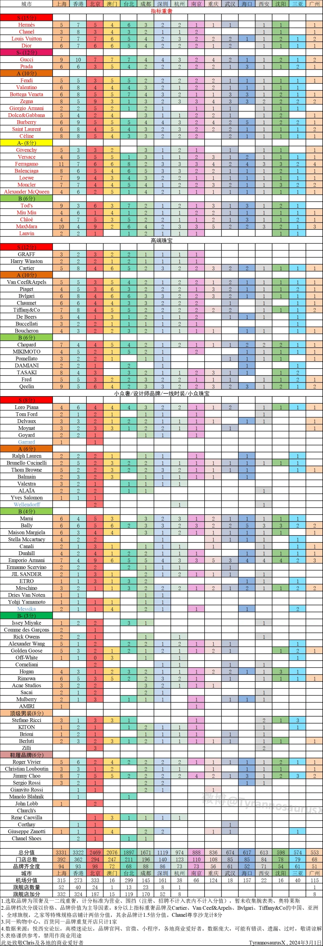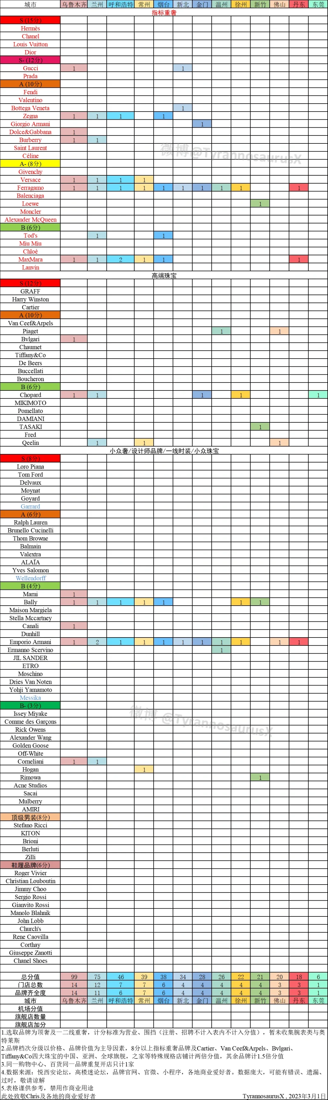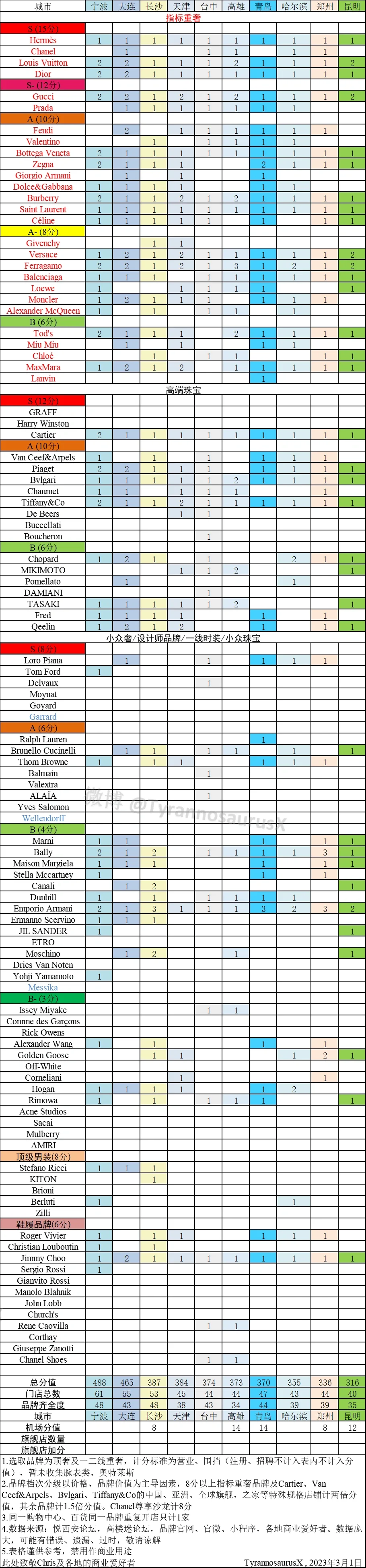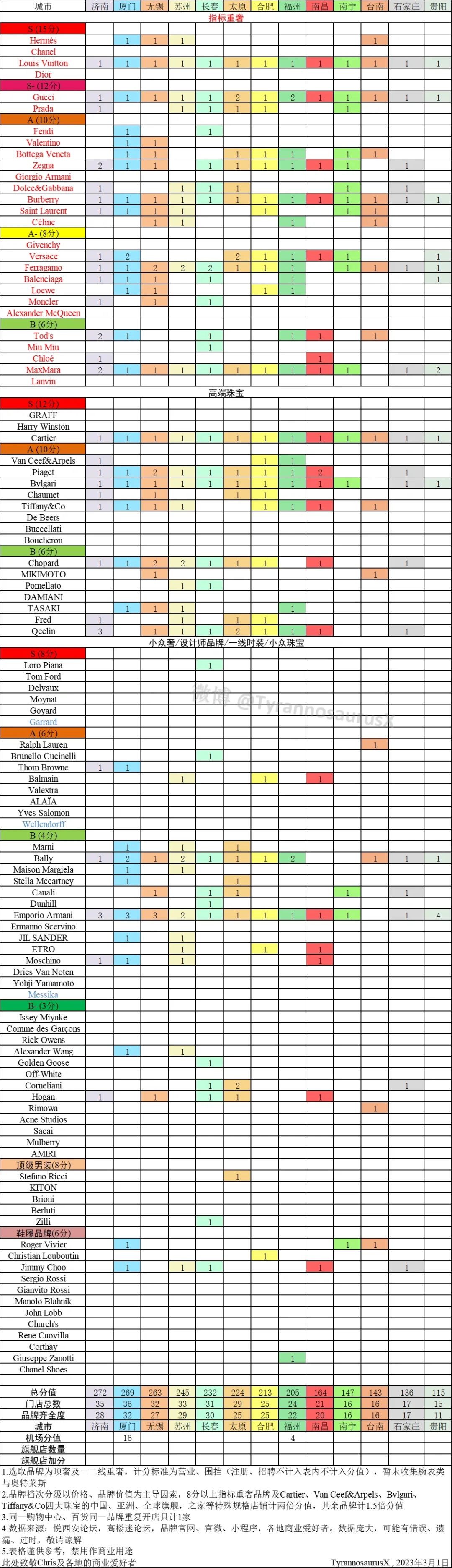 中国城市高端品牌统计3月1日更新