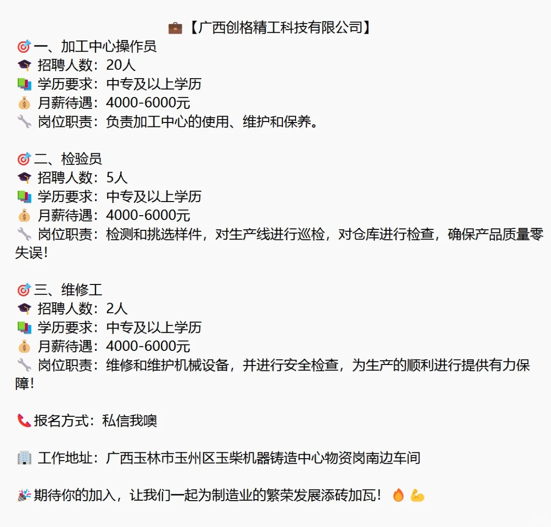 📌【广西创格精工科技有限公司】招聘来啦!优质岗位等你加入!