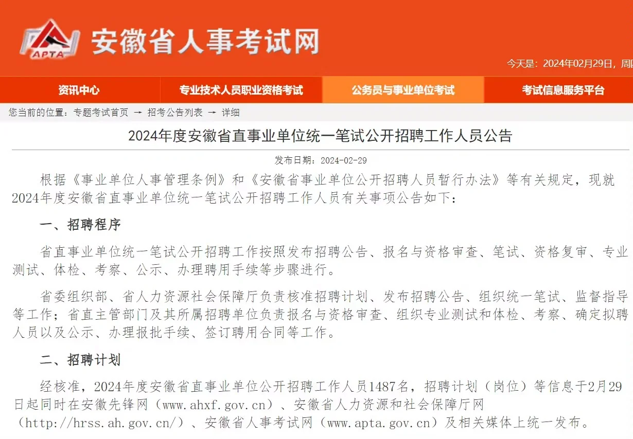 经核准,2024年度安徽省直事业单位公开招聘工作人员1487名,招聘计划(岗位)等信息于2月29日起同时在安徽先锋网(www.ahxf.gov.cn)、安徽省人力资源和社会保障厅网(http://hrss.ah.gov.cn/)、安徽省人事考试网(www.apta.gov.cn)及相关媒体上统一发布。